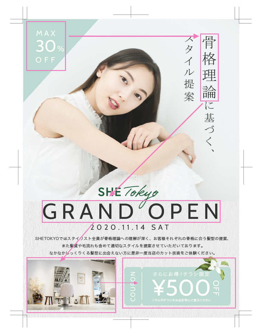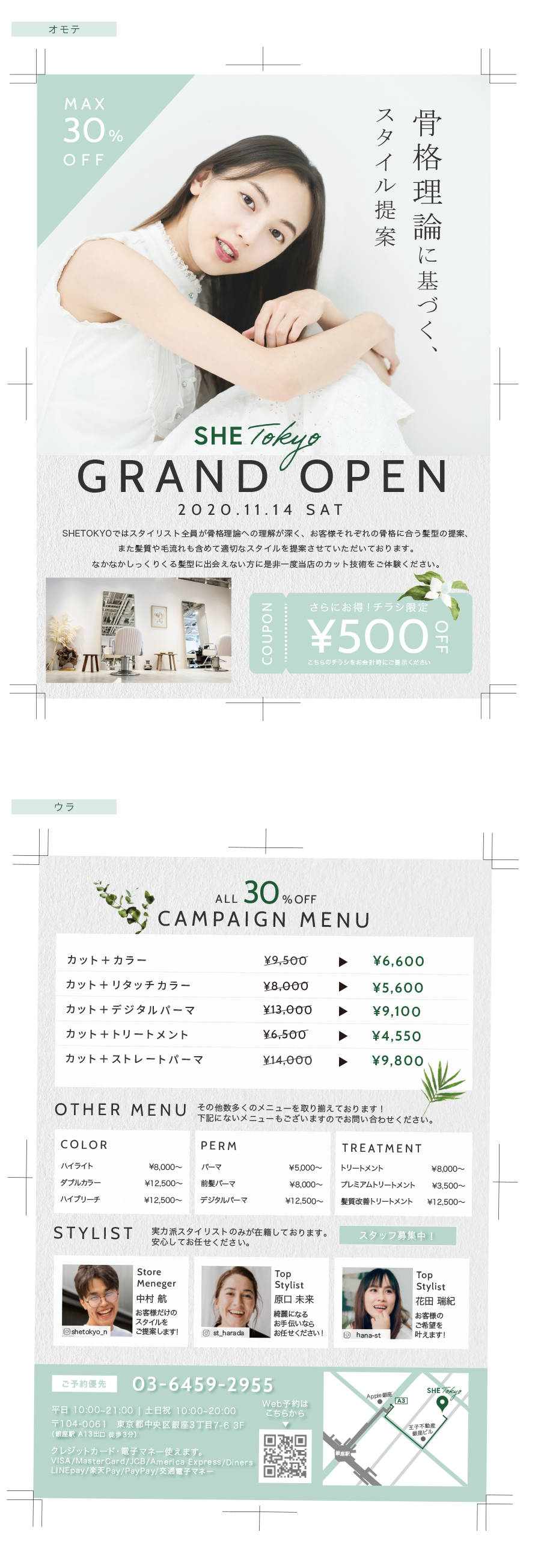 SHElikes MULTI CREATOR COURSEの課題でグランドオープンする美容室のフライヤーを制作しました。制作時間:20時間