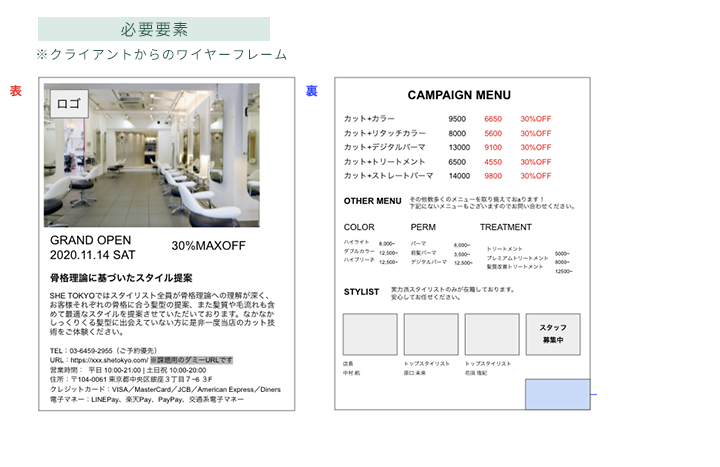 SNSで情報収集をするのが主流になっていて、フライヤーに目を通す人も減少傾向になっている中で、ひと目で興味を持ってもらえるようにZの目線を意識し情報設計をしました。最後に500円クーポンを持ってくることで裏面にも目を通してもらえるように工夫しました。