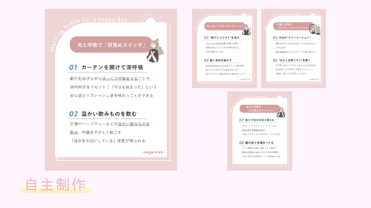・ターゲットが自身の生活にも取り入れられそうと思えるような簡単なTipsにするよう意識した。