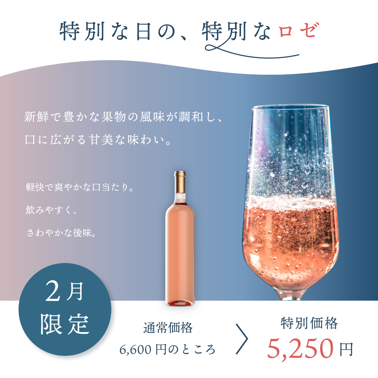 - タイトルの「ロゼ」と特別価格の「5,250円」の目立たせたい部分をロゼのカラーと揃えることで視認性を高めました。