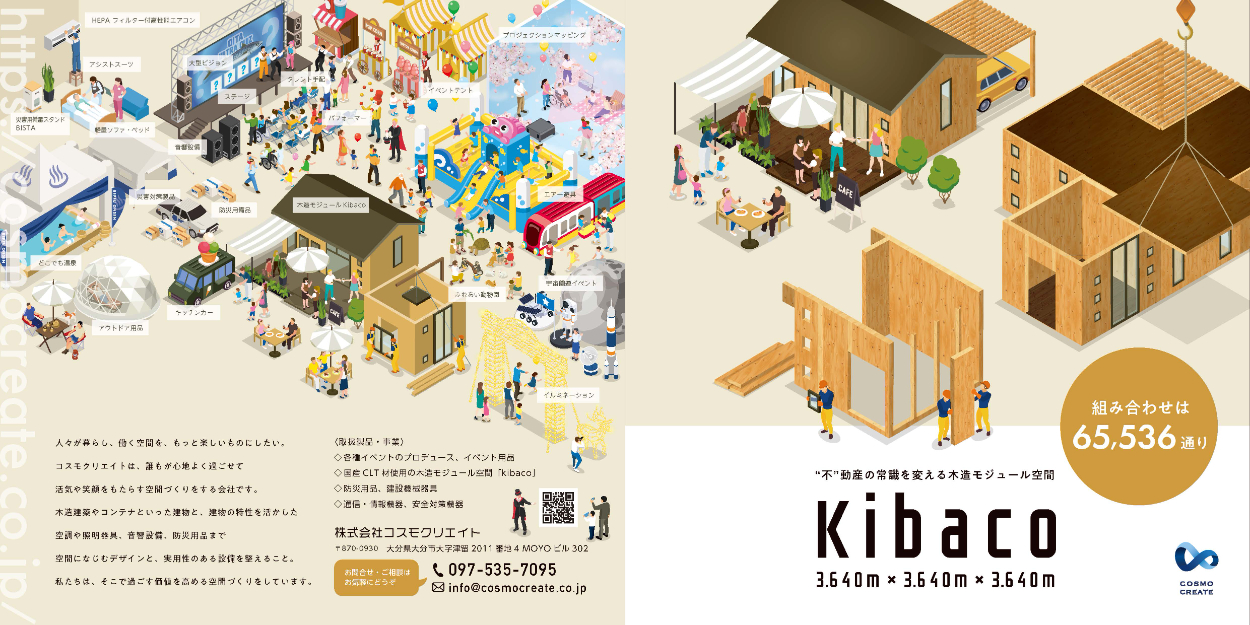 移築できる木造建築物「Kibaco」の展示会用販促ツールと、ノベルティグッズの企画編集をしました。