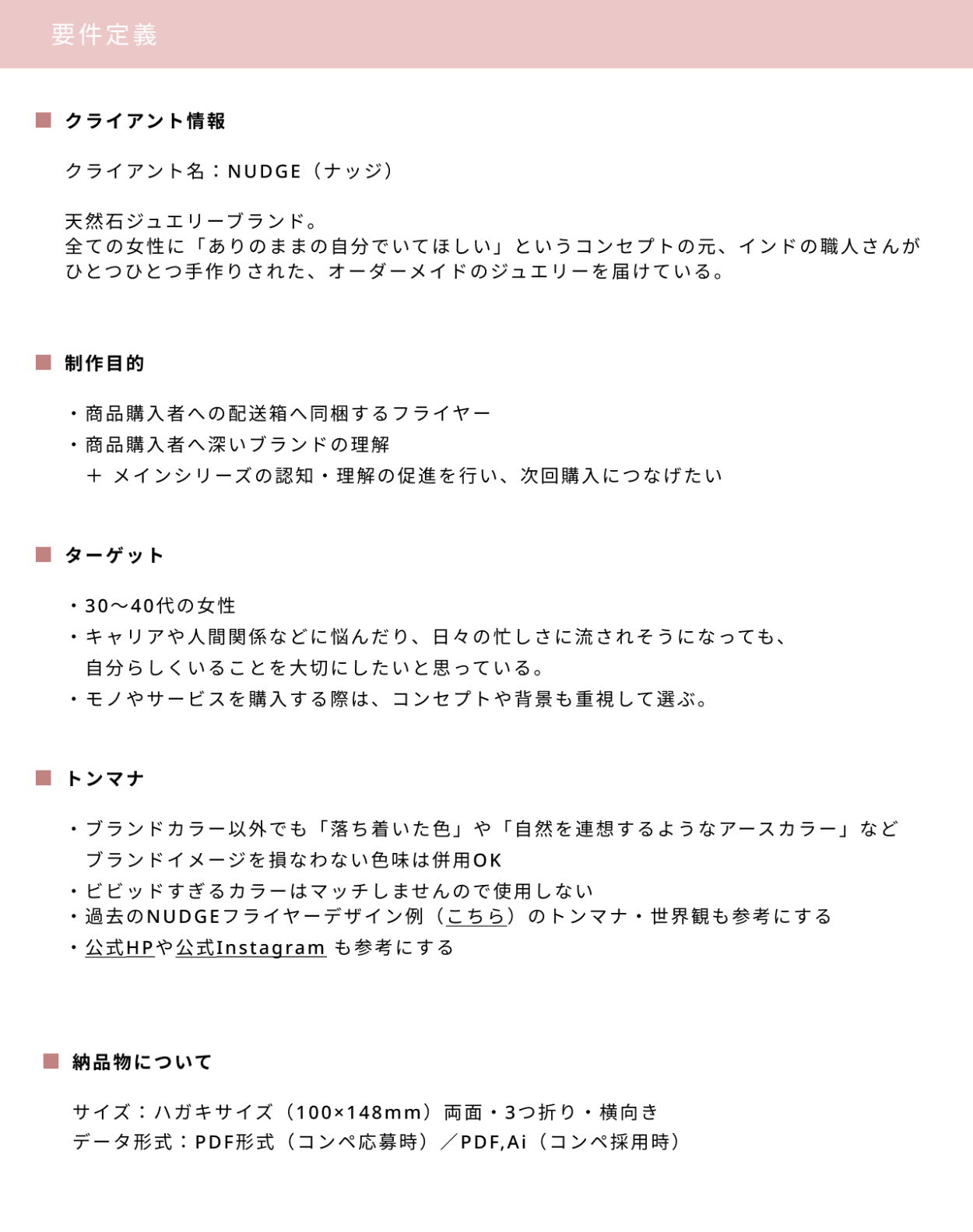 天然石ジュエリーブランドNUDGE様の3つ折りフライヤーコンペに参加した際の作品です。応募数79作品中の中から採用作品1つ・ノミネート作品3つが選出され、ノミネート作品として選ばれました。 [ 使用ツール:Illustrator 制作期間:6時間]