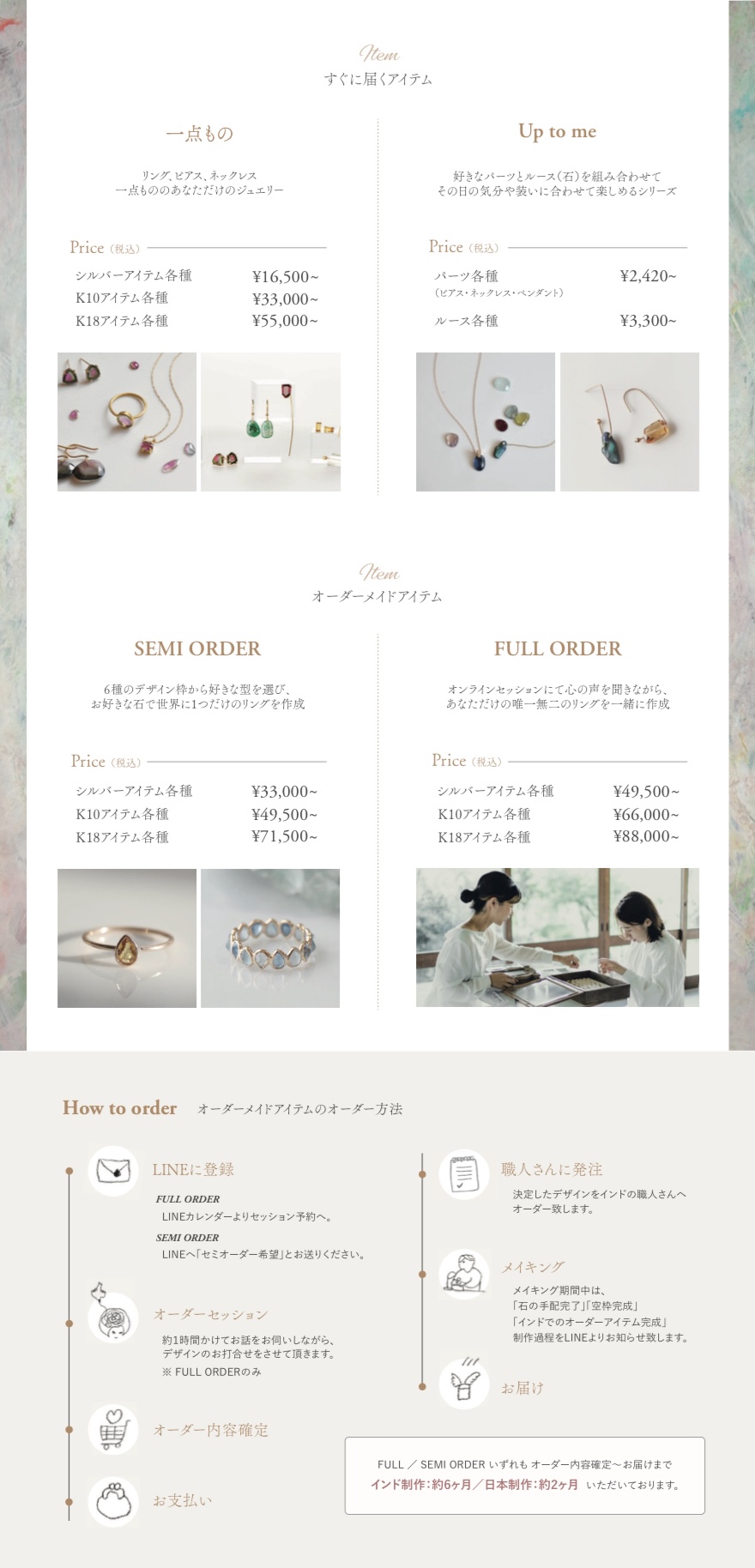 また、how to order も非常に見やすく、特にお客様にとって重要なライン登録時にセミオーダーとフルオーダーでアクションが異なる点や、制作する国の違いで納期がことなる点が情報としてわかりやすくまとめられていました。