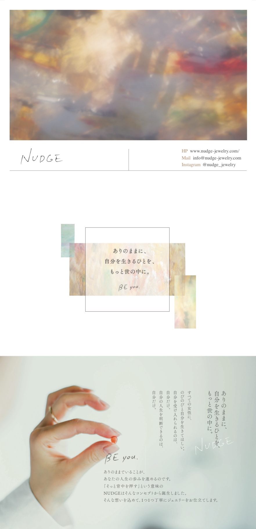 ・色彩感も、フライヤー全体に「NUDGEの商品を思わせる輝くような色鮮やかさ&ターゲットの30~40代女性を思わせる落ち着いた美しい色味」がバランス良く行き渡るように、何度も引きで見ながら調整をしました。