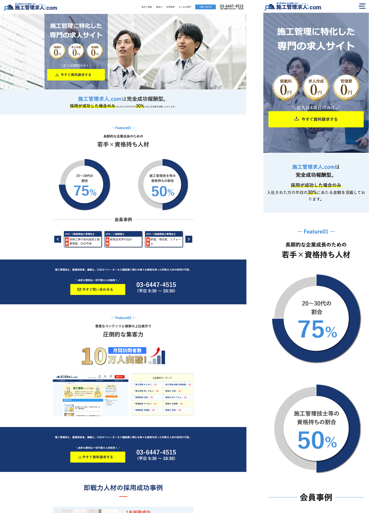 施工管理に特化した完全成功報酬型の求人サイト「施工管理.com」です。 インハウスデザイナーとして、こちらのLPサイトリニューアル時のデザイン、コーディングを担当しました。