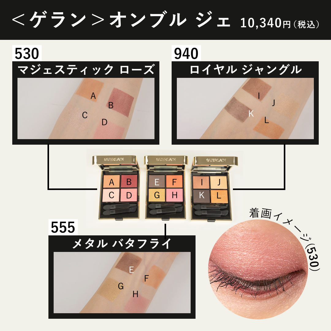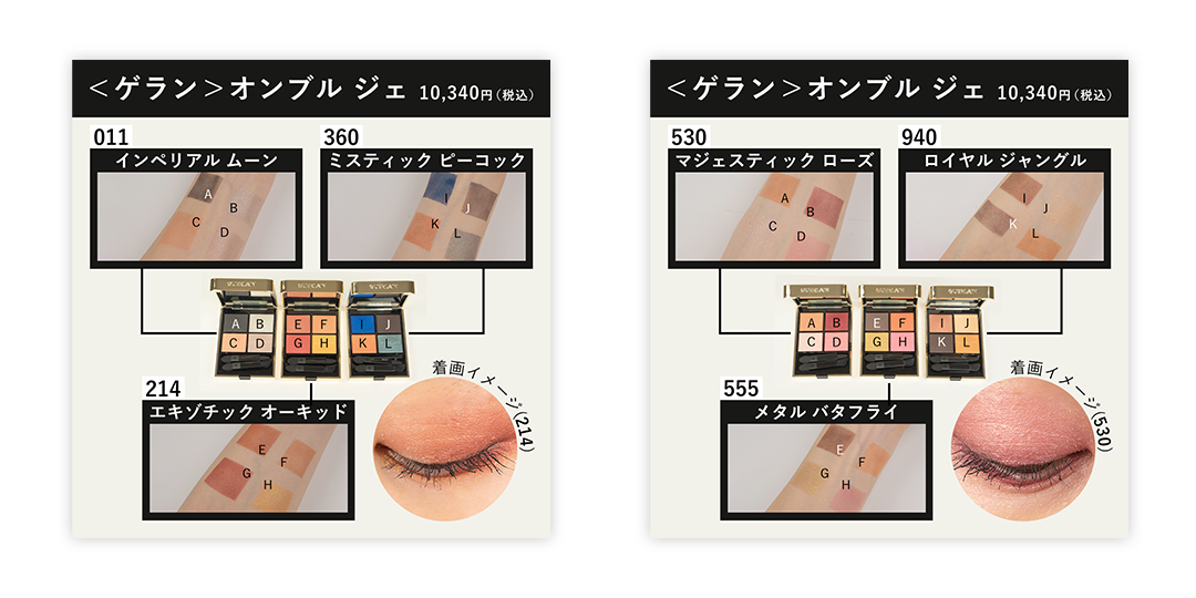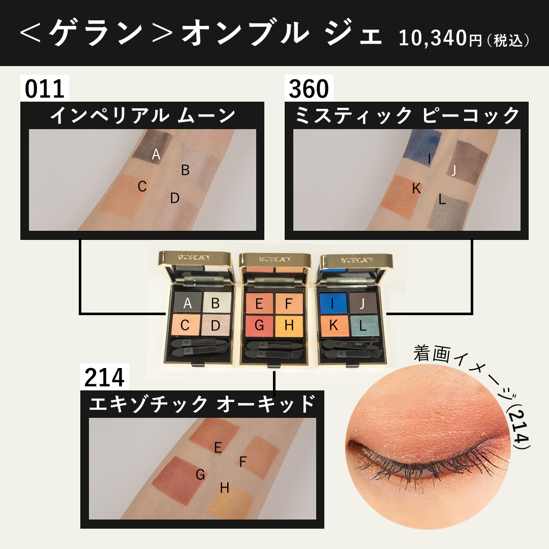 - 商品名 ▶︎ <ゲラン>オンブル ジェ/011 インペリアル ムーン/エキゾチックオーキッド/360 ミスティック ピーコック/530 マジェスティック ローズ/555 メタル バタフライ/940 ロイヤル ジャングル