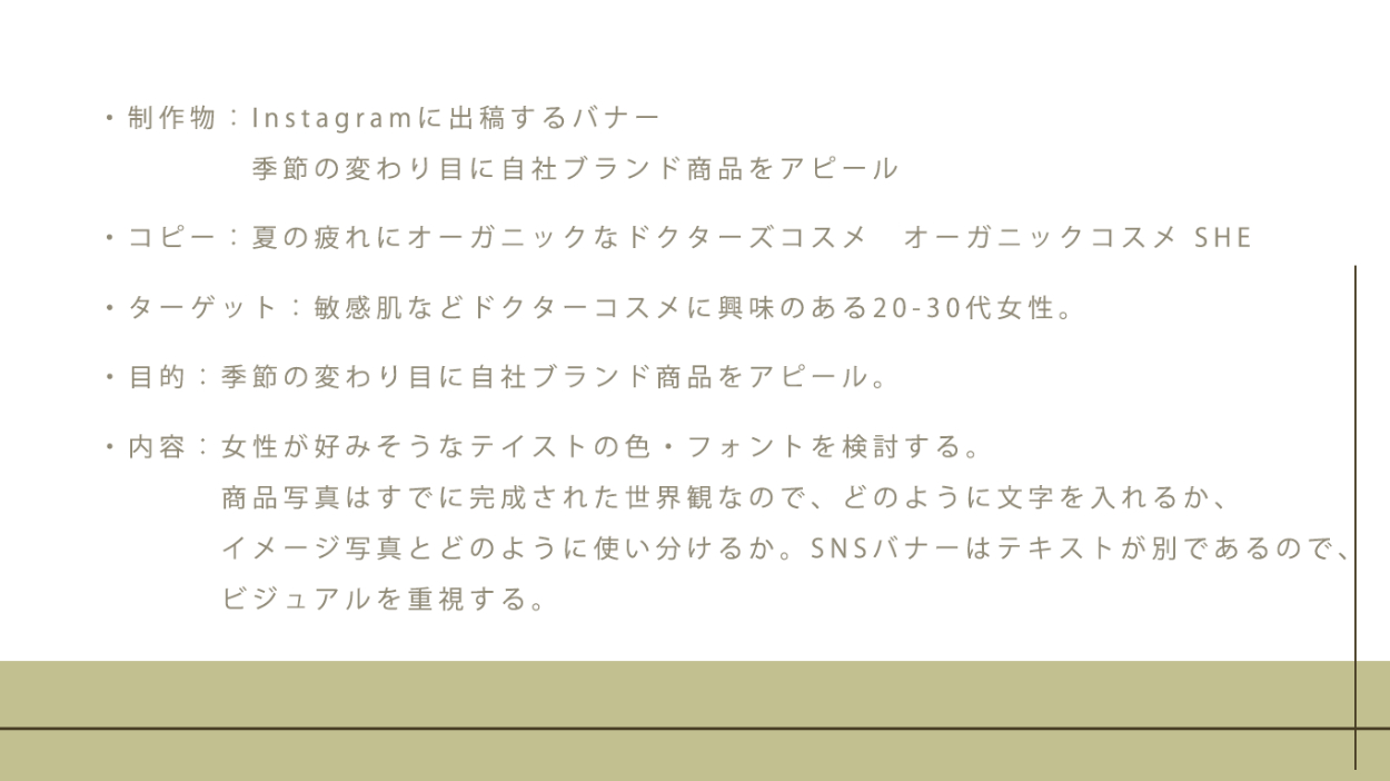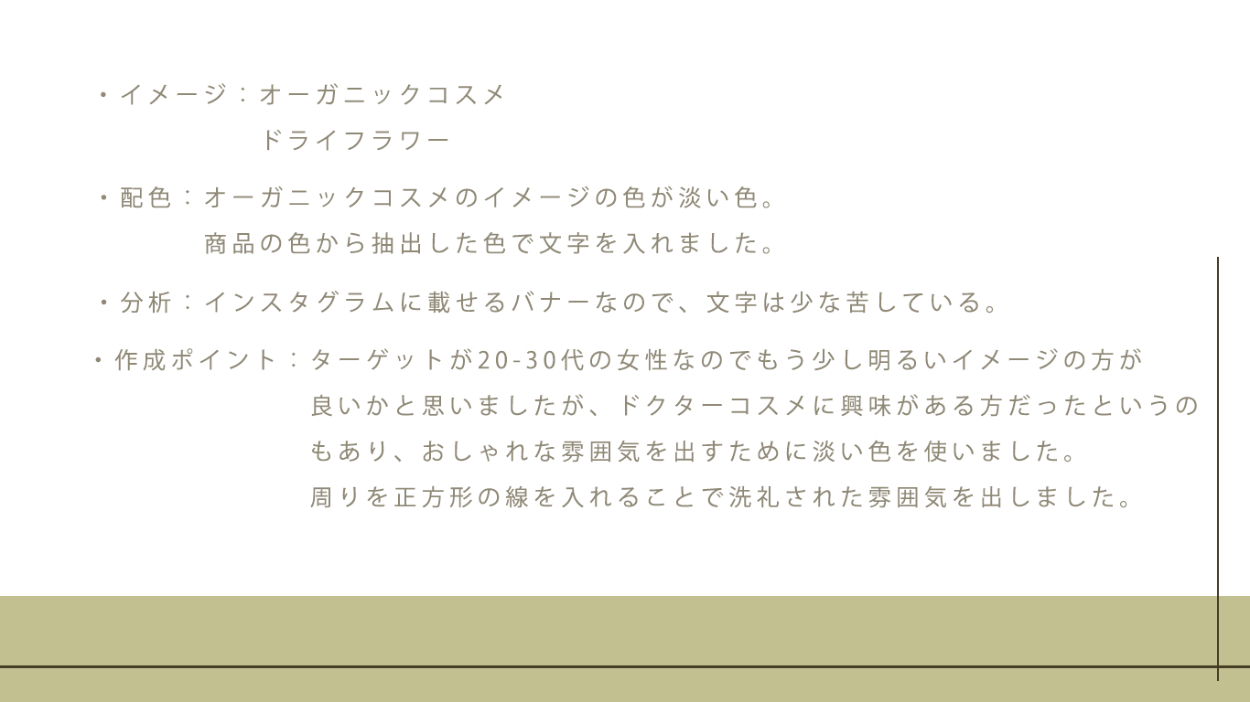架空バナー制作(コスメバナー) c o c o | shelikes OVERVIEW SHElikes デザイン演習コース にてコスメバナー制作課題に取り組みました。 YEAR 2022 ◎制作概要 ・制作範囲 : バナー制作(1枚) ・使用ソフト: photoshop◎要件定義◎制作時のポイント