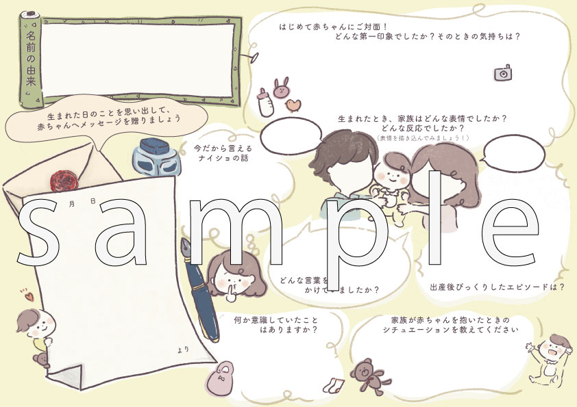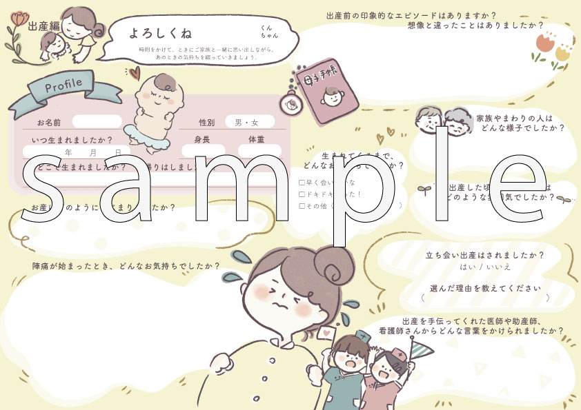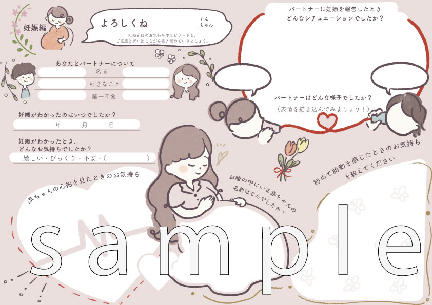 かけがえのない時間であるにもかかわらず、環境や体の変化から、あっと言う間に過ぎ去ってしまう、「妊娠・出産」の思い出を残すため、ママのその時をしっかりと言葉で残しておく振り返りシートです。