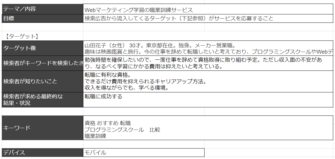①制作するLPのターゲット/キーワード/デバイスを決定