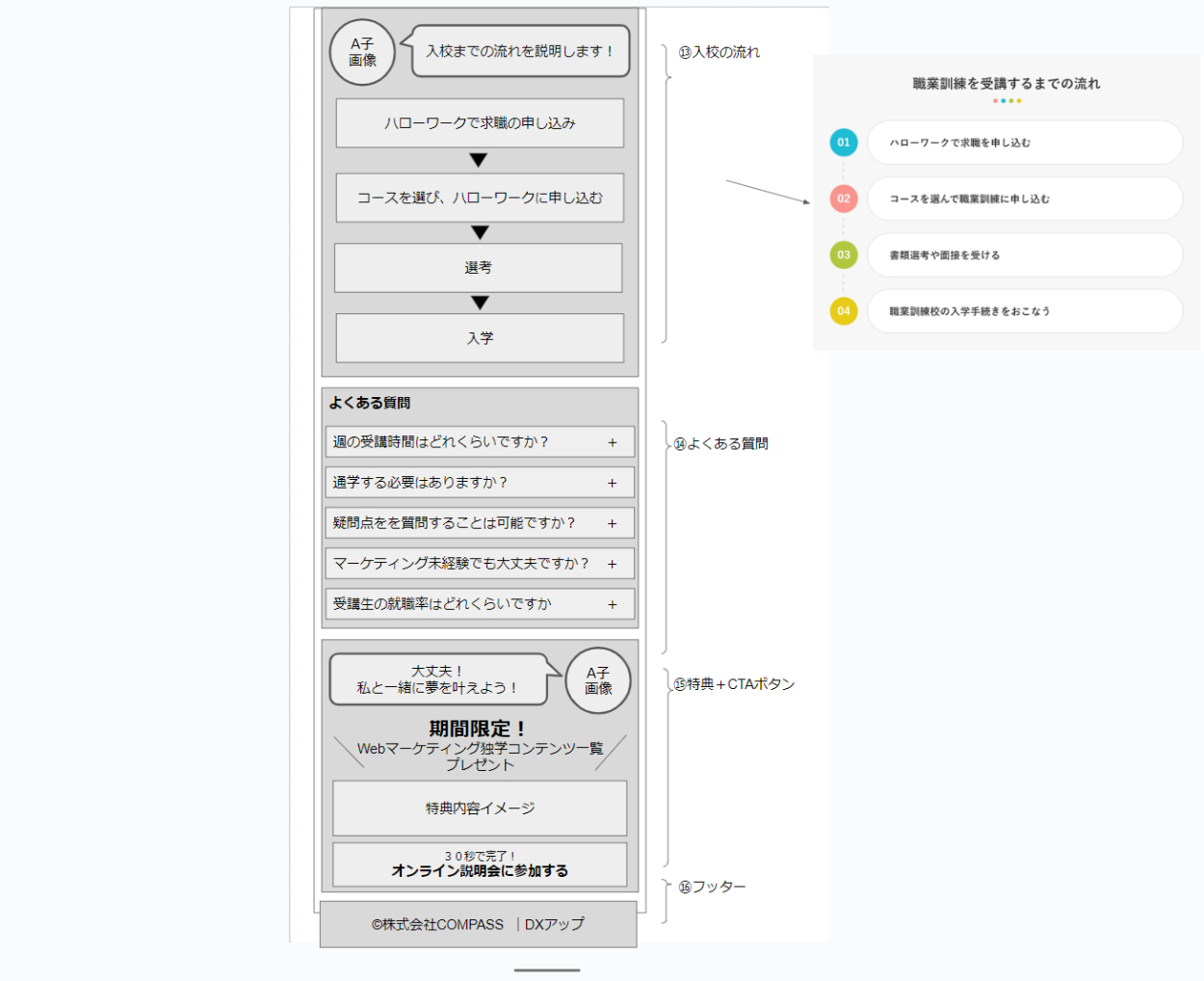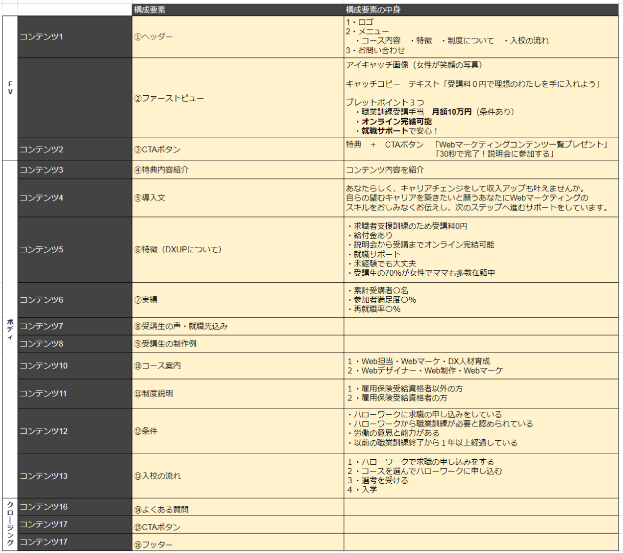 職業訓練のWebマーケティング課題で競合リサーチをした上でLPの要件定義、ワイヤーフレーム作成をしました。