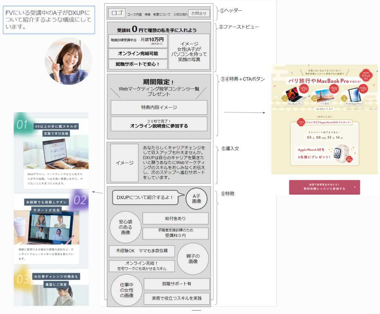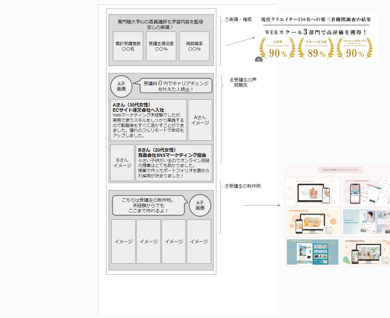 - 実績、転職が成功した卒業生の声、制作物の紹介で信頼を得てコース選択へ誘導する導線にしました。