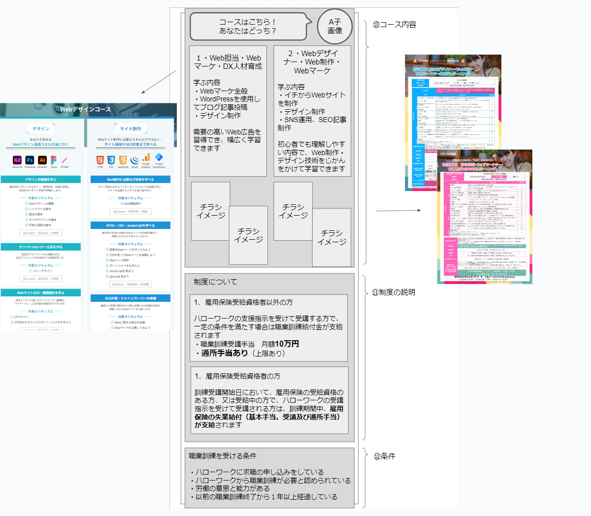 - 一番の強みだと感じた受講料0円をキャッチコピーに置いてインパクトを狙いました。