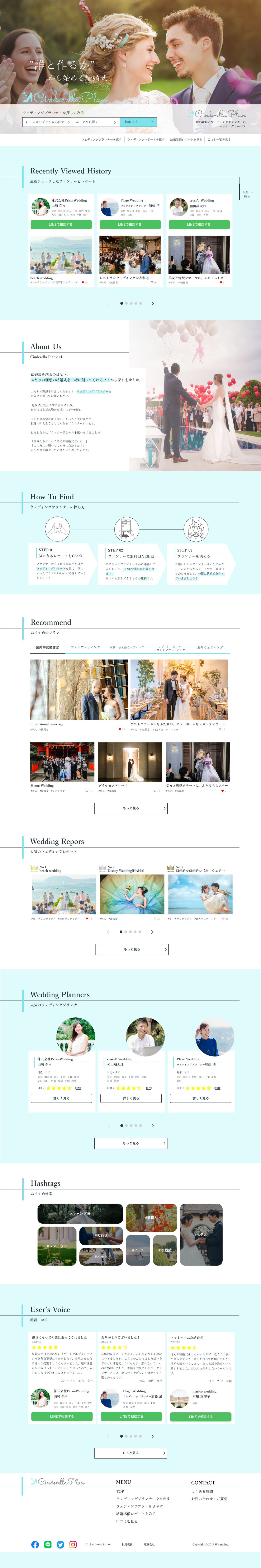‐ 結婚式関連のサービスということで、水色#E0FBFCをメインに白と、シンデレラプランのロゴの色をアクセントカラーにし清潔感のある印象にしました。