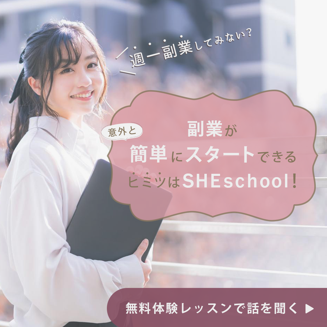 - 「副業」が「簡単」に「スタート」できるのは「SHEschool」なんだ!と思ってもらえるように、特に目立たせたい文字を大きくして、白よりのグレーにすることで強調させました。