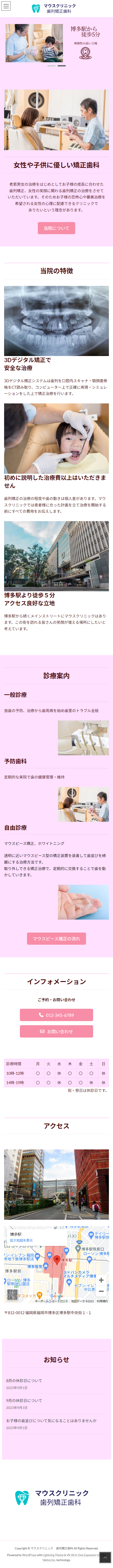- ファーストビューに親子の写真、キャッチコピー、博多駅から徒歩5分といった情報を取り入れて歯科を探しているターゲット層の目に留まるようにしました。