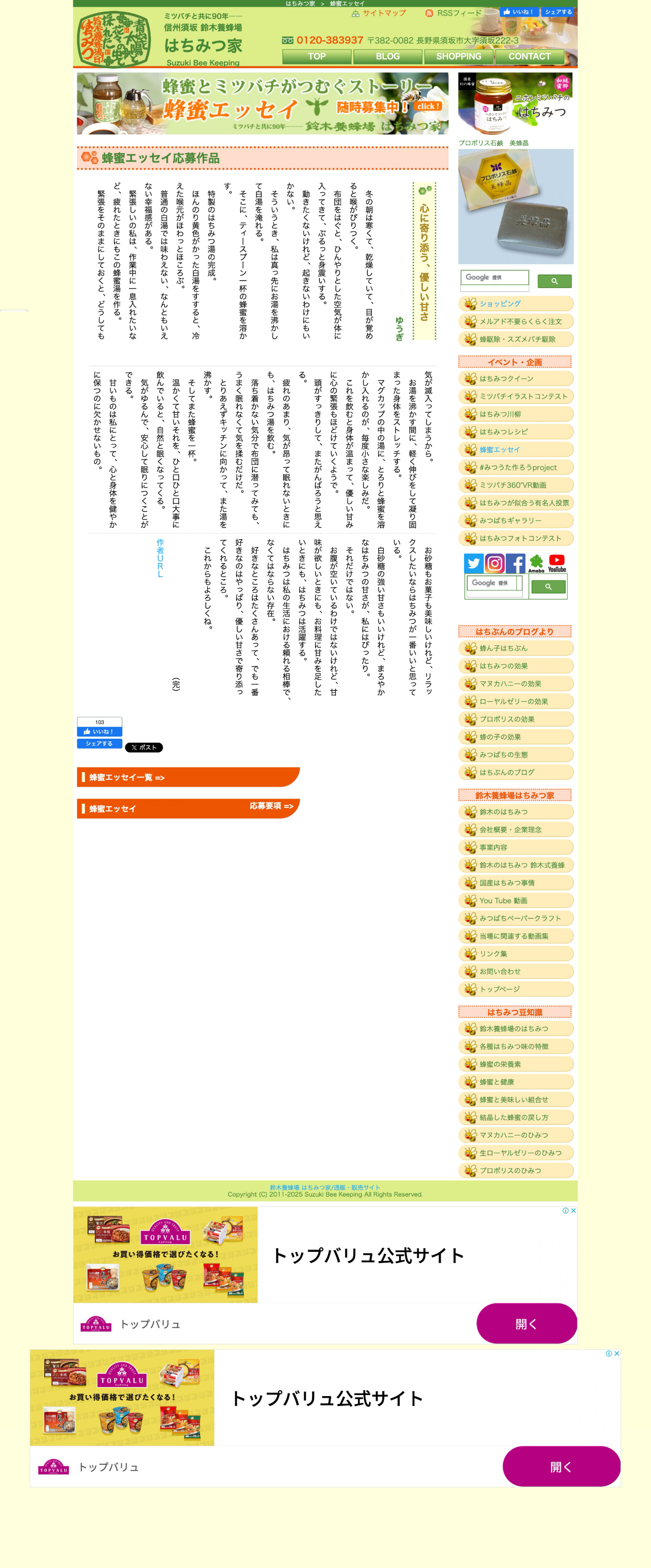 鈴木養蜂場「第9回 蜂蜜エッセイ」佳作