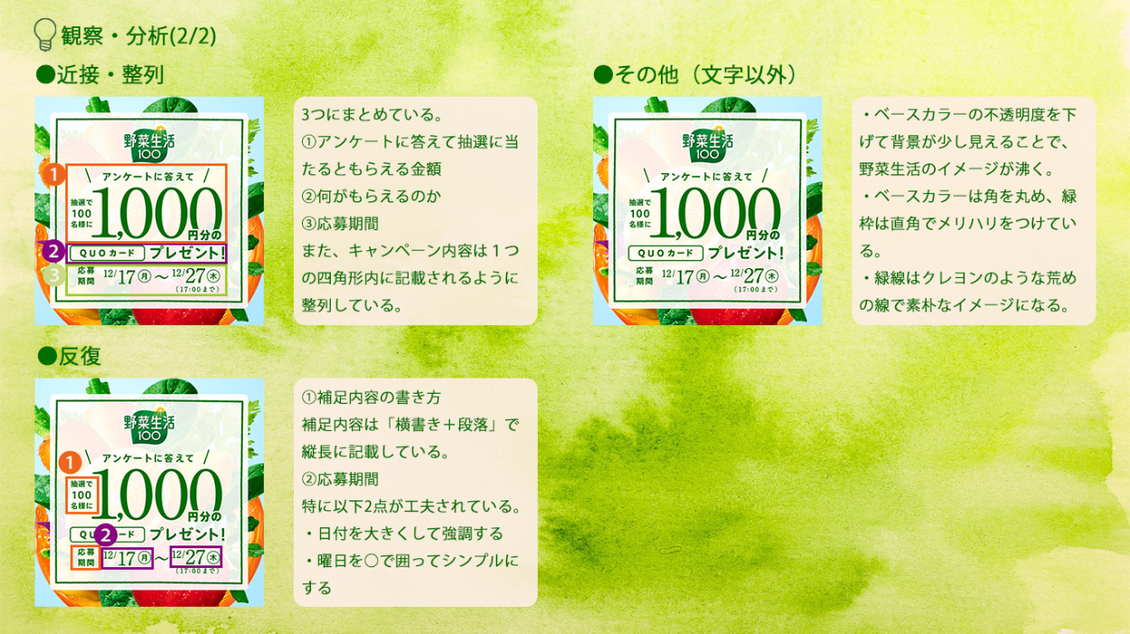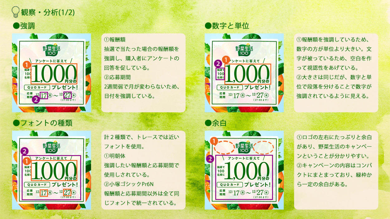 - 分析シートで使用した色は全て見本から抽出し、全体的に統一感が出るようにしました。