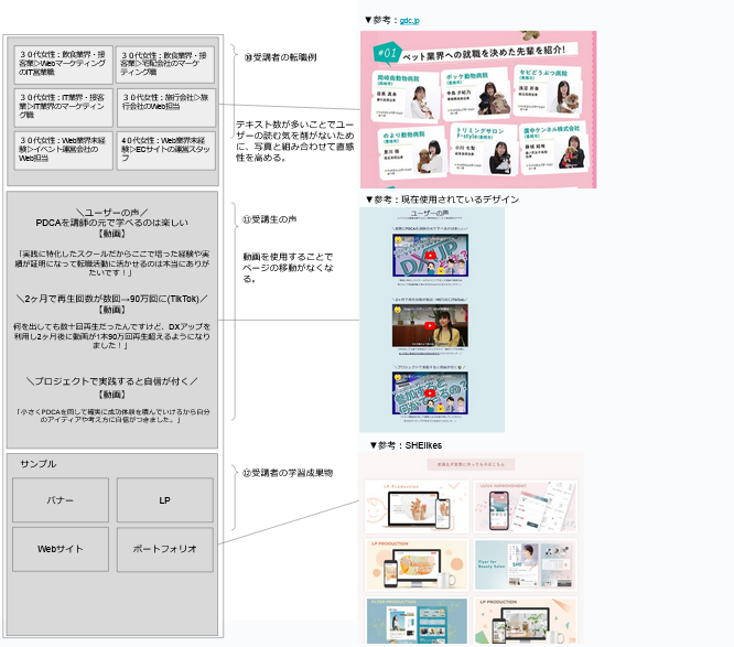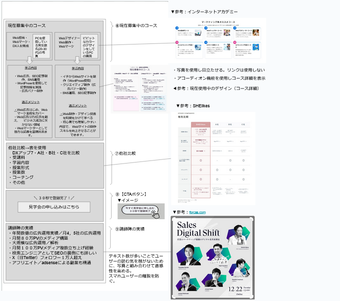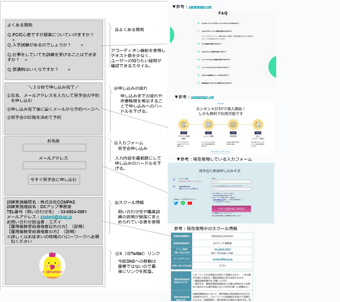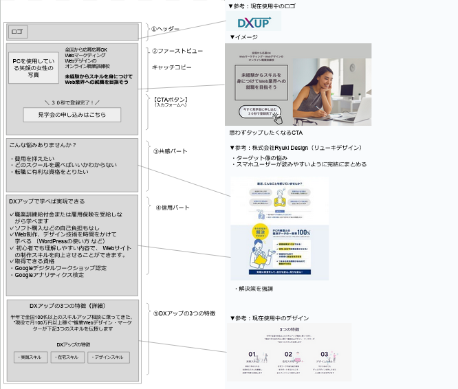 - Webマーケティング学習の職業訓練サービス【 DXアップ】のLPを作成するにあたって、ワイヤーフレームを作成しました。