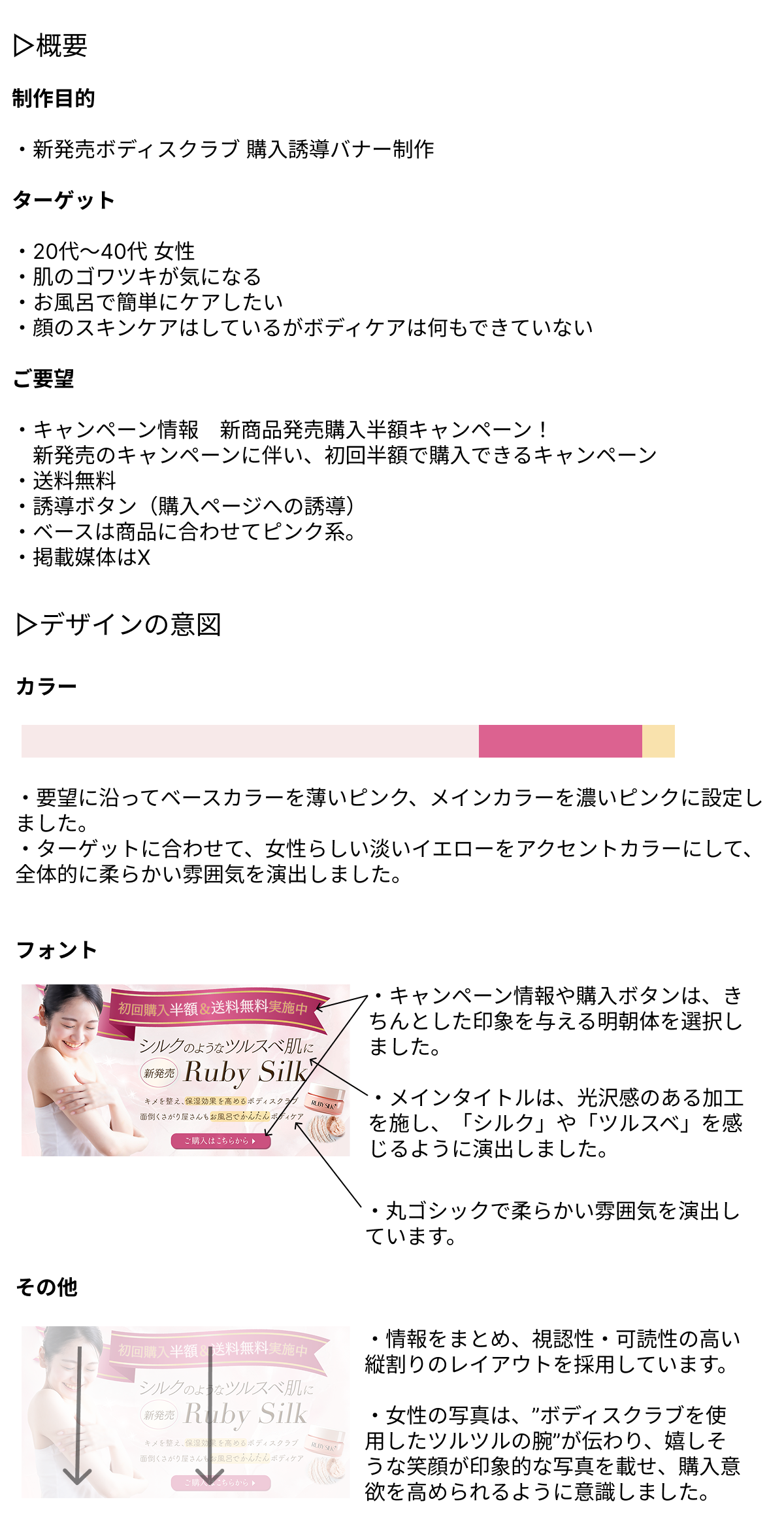 [架空案件]新発売ボディスクラブ 購入誘導バナー Chihiro.H Webデザイナー OVERVIEW Webデザインスクール「HerTech」様の課題で作成したInstagram用のバナーです。 YEAR 2025 ▷制作物サイズ:1200px × 628px使用ツール:Photoshop