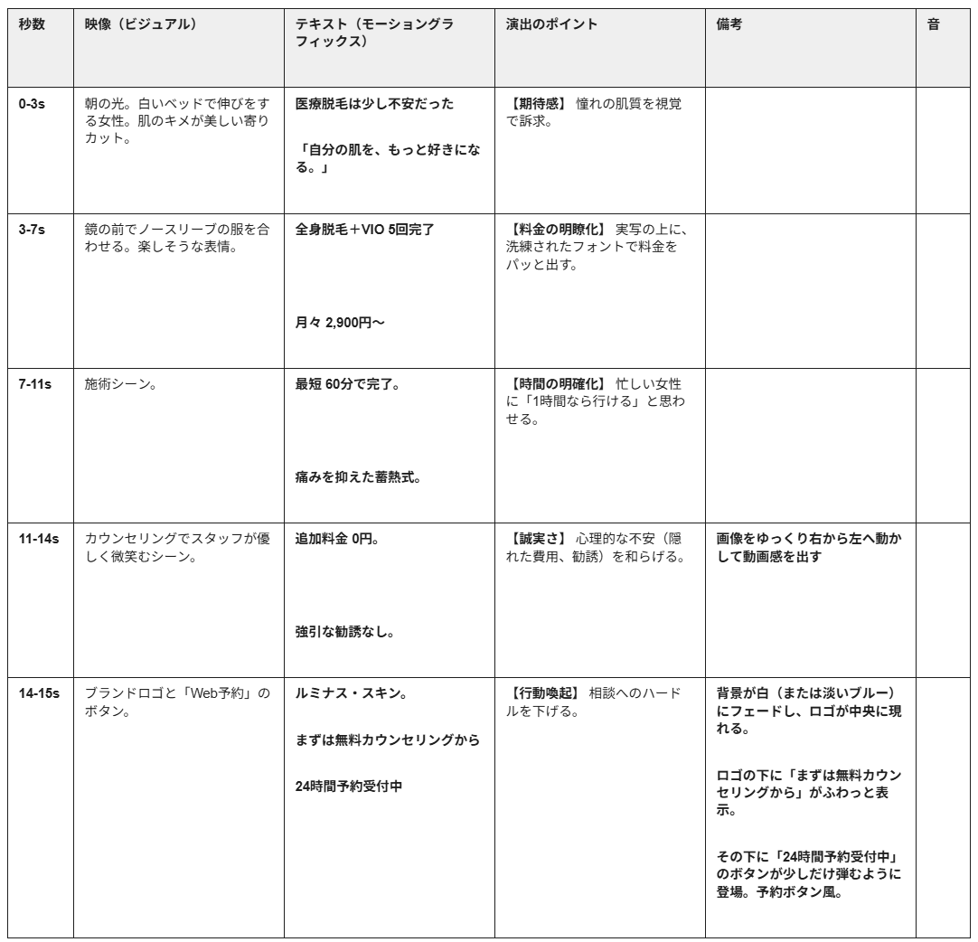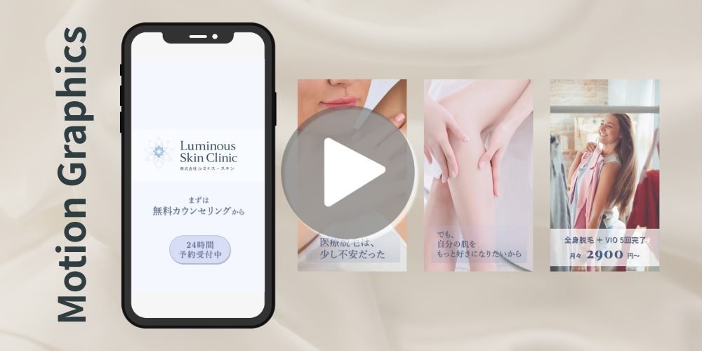 - 「カミソリ負けで悩む朝」から「ツルスベ肌で好きな服を着て出かける朝」へのビフォーアフターを、過度な加工ではなく、光の美しさや質感で表現。視聴者が「このクリニックなら自分の悩みを分かってくれそう」と感じられるように。
