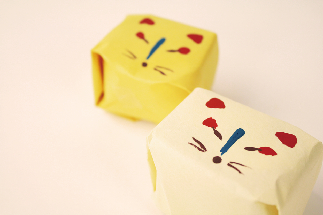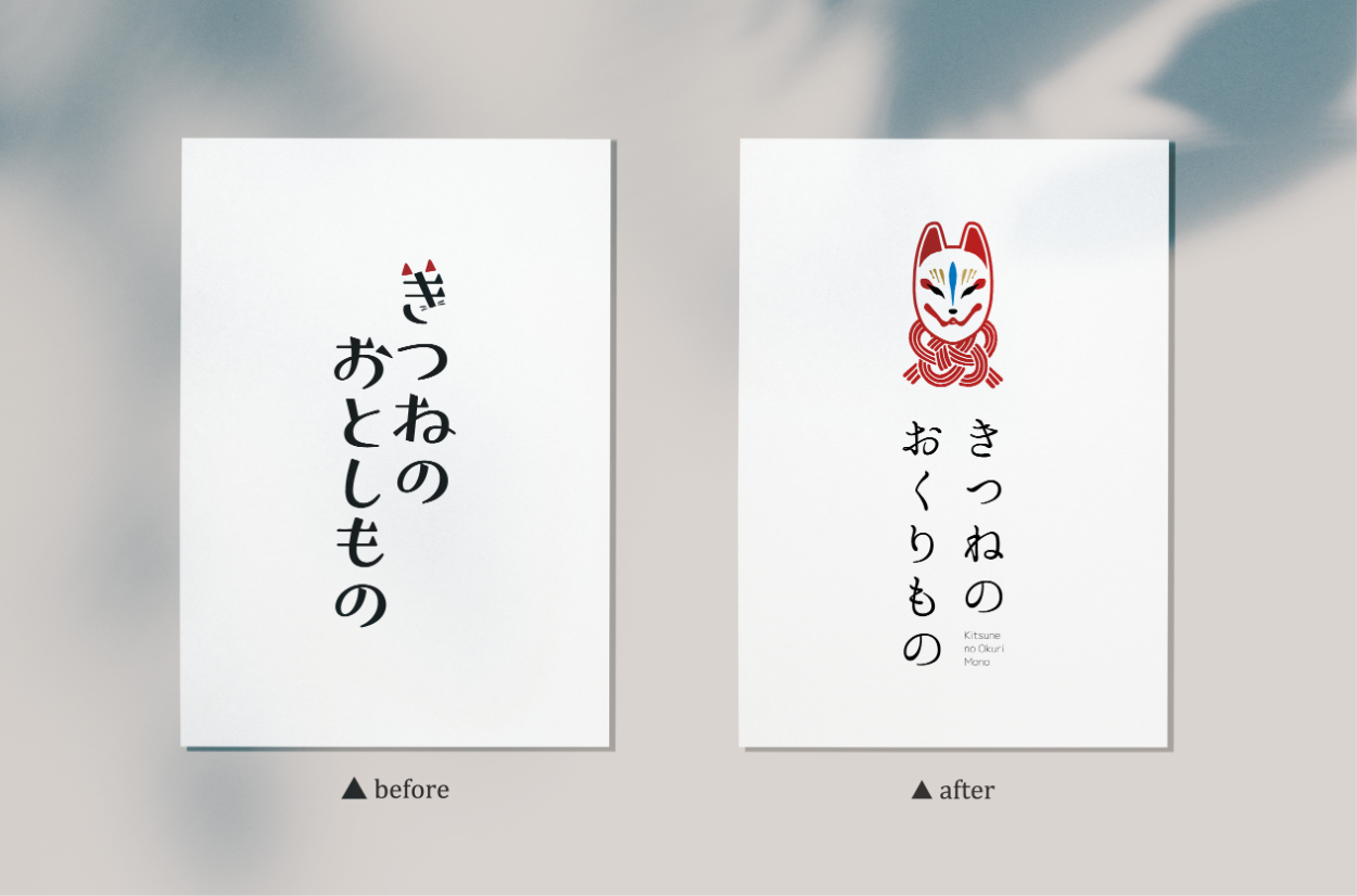 私の地元、山口県下松市にある花岡八幡宮の狐の嫁入り伝説をモチーフに、白狐の形を模した最中のパッケージを制作しました。商品の包装のデザインはそのままで、商品名を「きつねのおとしもの」から「きつねのおくりもの」に、そしてロゴをリデザインしています。