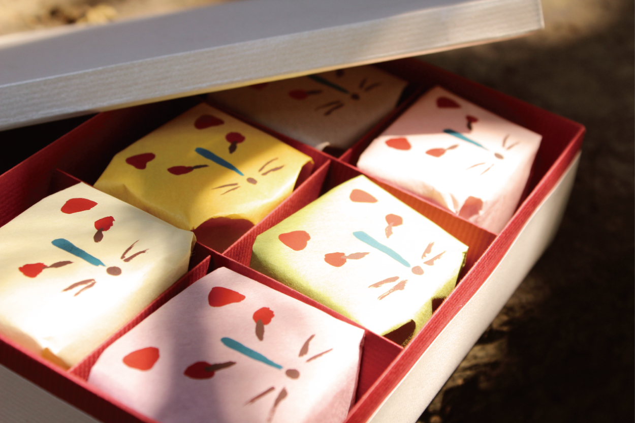 ロゴを狐のお面と蝶結びの水引のデザインにしたのは、この商品のコンセプトが狐の結婚式のお返しであることもあるのですが、蝶結びの水引は「何度起きても喜ばしいこと」に使用されるので、この最中を贈った人、贈られた人の縁が結ばれること、そしてこの最中を食べ、この街のことを知ってくれたという喜ばしいことが何度でも起こりますようにという願いを込めています。