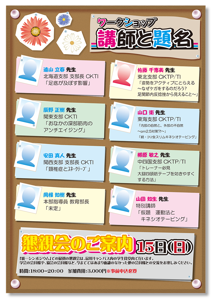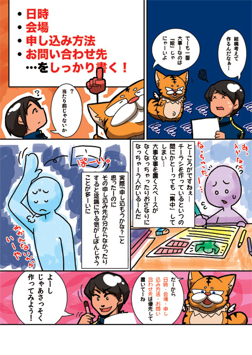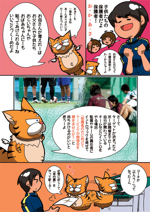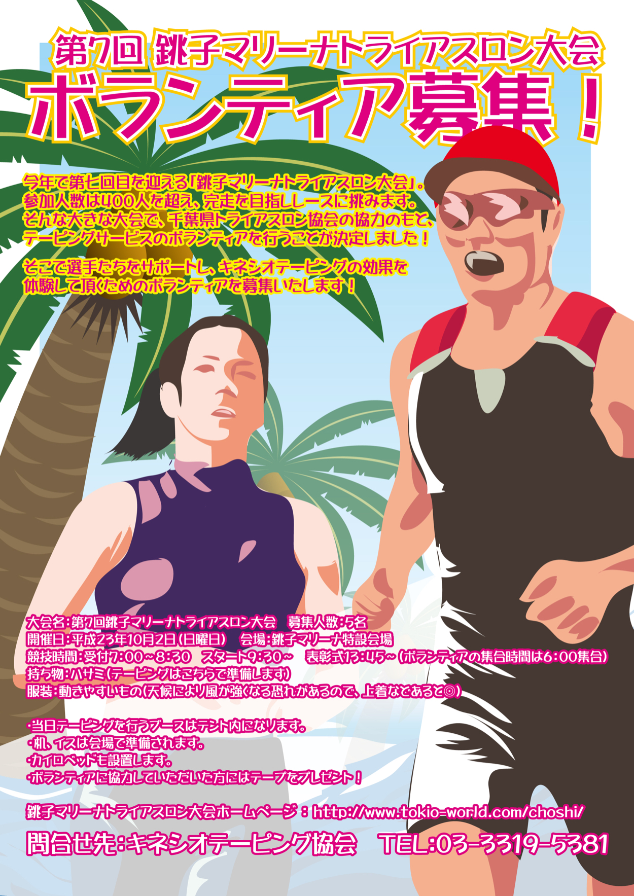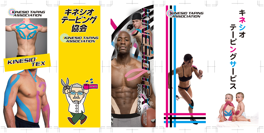 スポーツテーピング協会のボランティア募集チラシ。文言や詳細を担当営業からいただき、デザインを全て作成。 テープの貼り方講座のHowTo漫画の作成、学会開催時の小冊子の作成やボランティア時に使用するノボリの作成・データ納品なども対応。