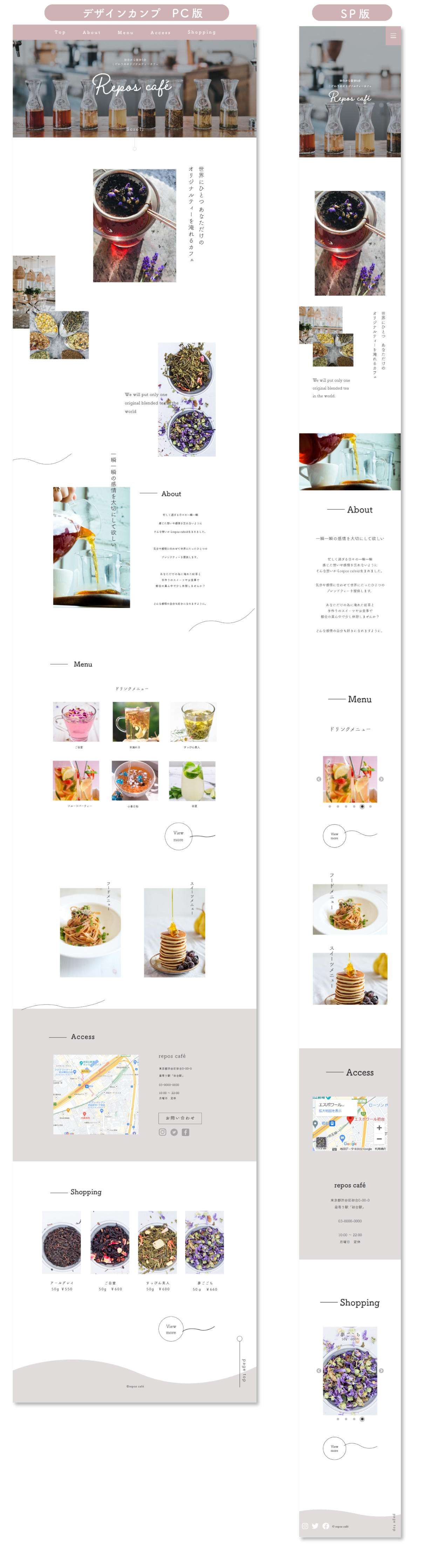 明度の高いピンクだとカフェのイメージより化粧品のサイトのようなイメージに近いと思ったため、明度を抑えたピンク色をアクセントとし、色数を抑えシンプルなイメージにしました。