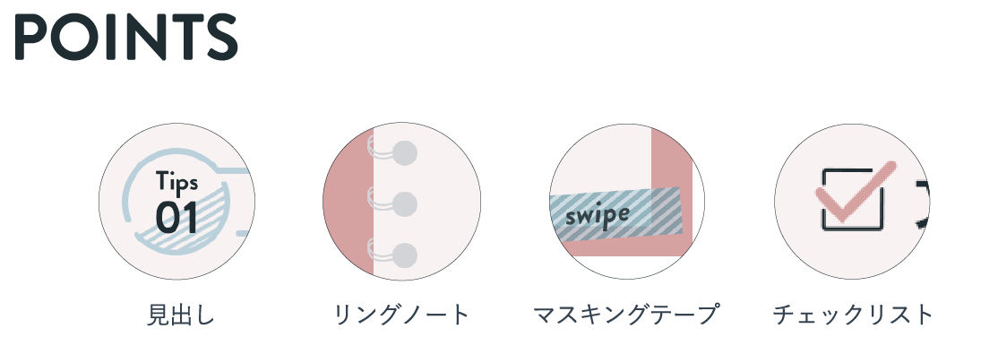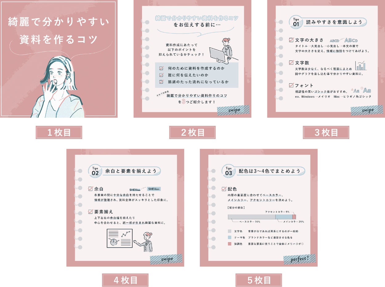 見出しはパッと目を引くデザインと、見出し文を囲うことで重要度を強調させました。また、資料を連想させるようなあしらいをいくつか挿入しました。Z型の視線誘導の終着点にスワイプの文字と、5枚目にはパーフェクトの文字を入れる事で動作の誘導と終わりであることを伝える情報を載せました。