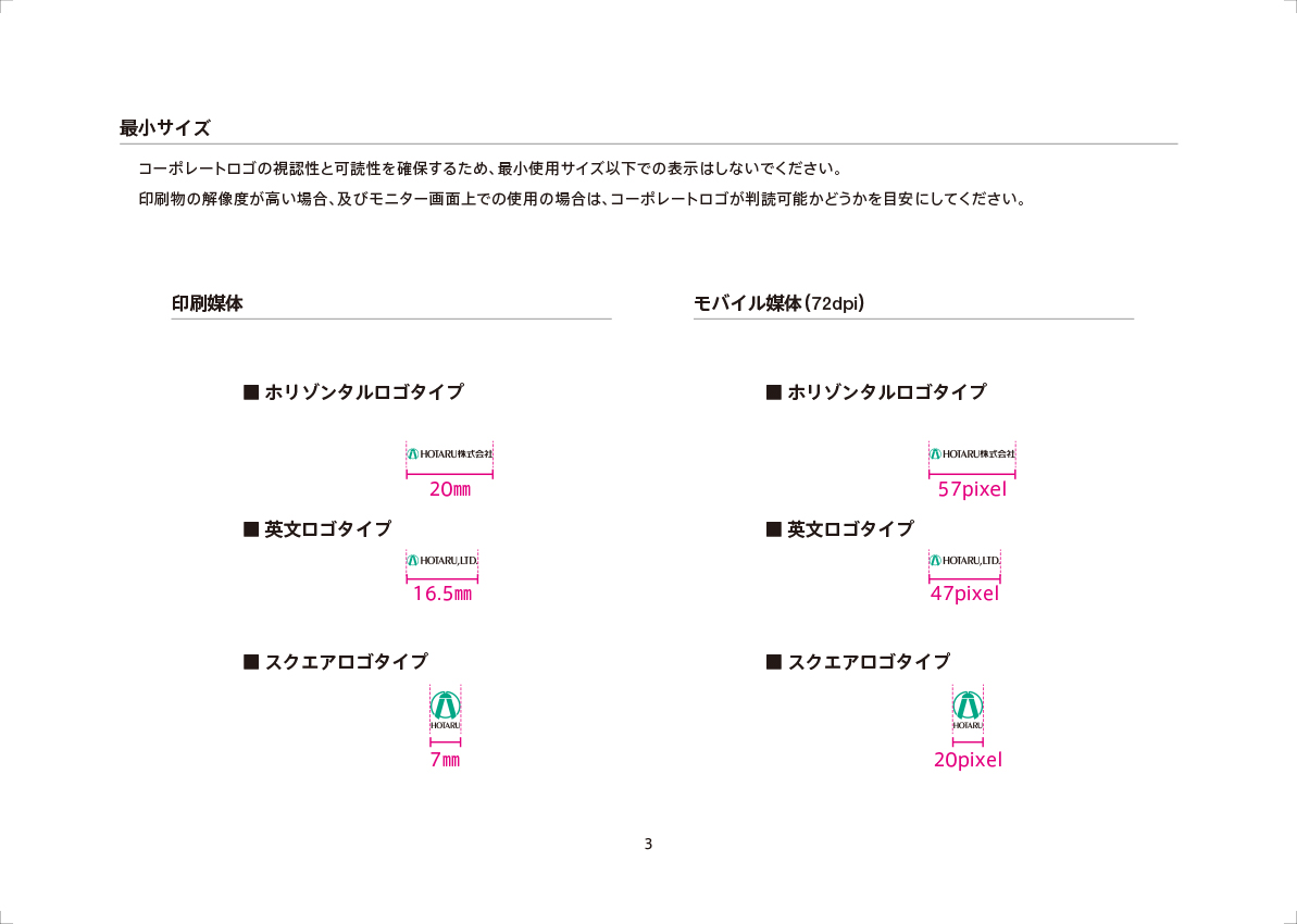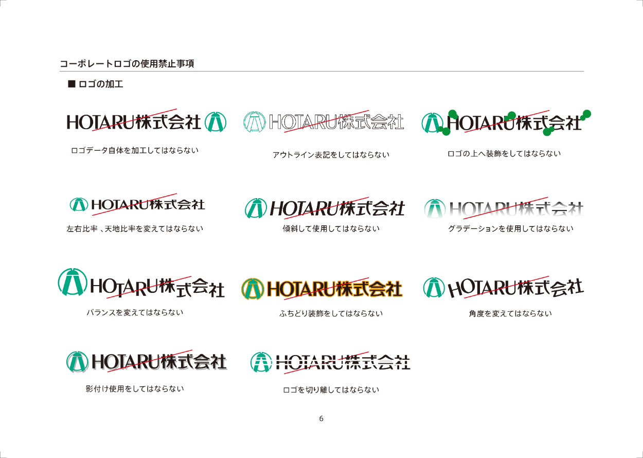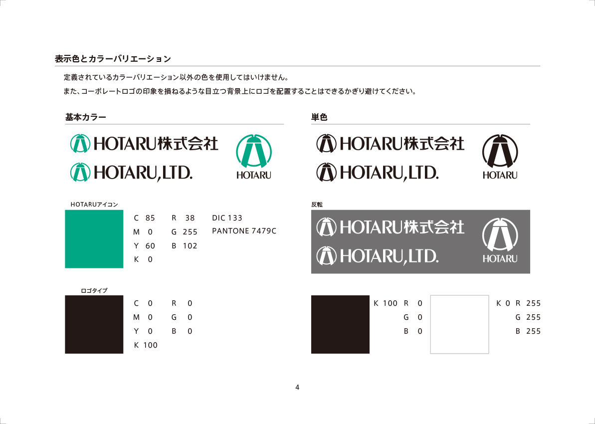 HOTARU株式会社 ビジュアル・アイデンティティ PORTFOLIO ディレクター / グラフィックデザイナー OVERVIEW IPOを意識したコーポレートロゴのレギュレーション策定 YEAR 2020 CI(コーポレート・アイデンティティ)の構成要素として、視覚的要素のVIを用い、社内の意識統一や共有を行い、組織の活性化を図ることを目的とした、どちらかというとデザインというよりはライティングというスタンスで取り組みました。