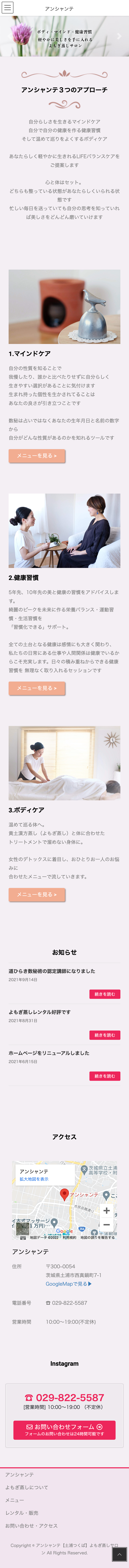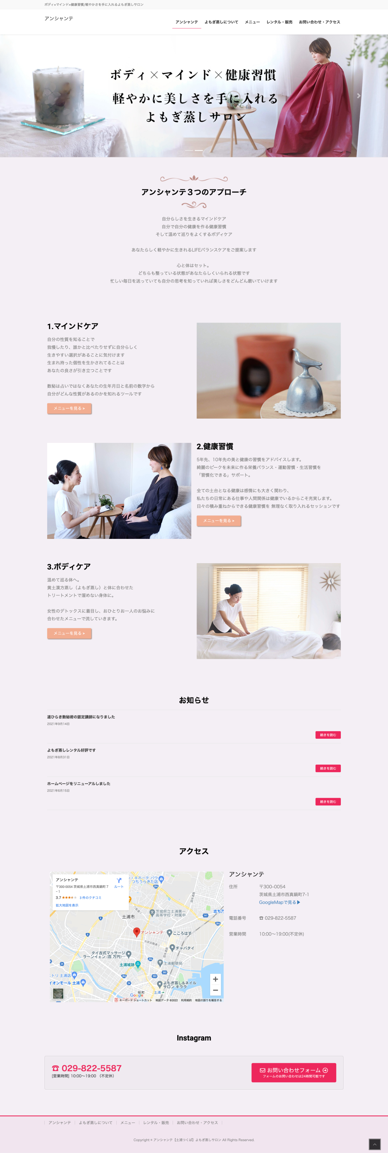 アンシャンテ様 HP制作 KOHARU webデザイナー OVERVIEW よもぎ蒸しサロン様のHP制作 YEAR 2021 クライアント情報よもぎ蒸しのほか、数秘術セッションや健康習慣アドバイスをおこなっているサロン様。Webサイトの目的新規顧客導入サービス内容の認知問合せの向上ターゲット20代〜40代の女性クライアント様のご要望できるだけシンプルにピンクやベージュを入れたいPC版スマホ版