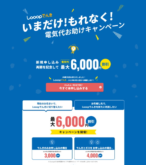 Looopでんき公式サイトの「いまだけ!もれなく!電気代お助けキャンペーン」のLPサイト制作。 Figmaから画像書き出し〜コーディングを担当しました。