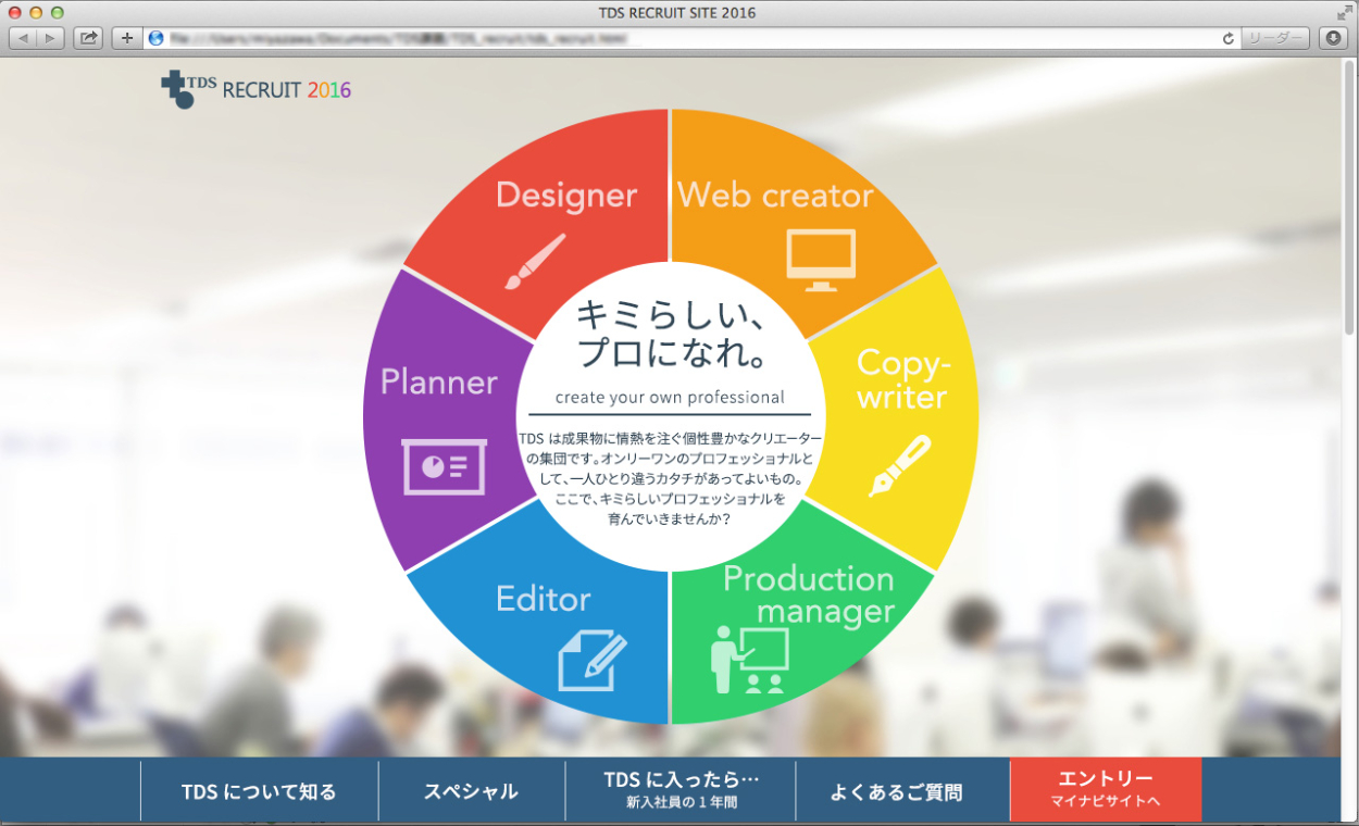 特徴は職種ごとの要項にすぐ飛べる円形のナビメニューです。