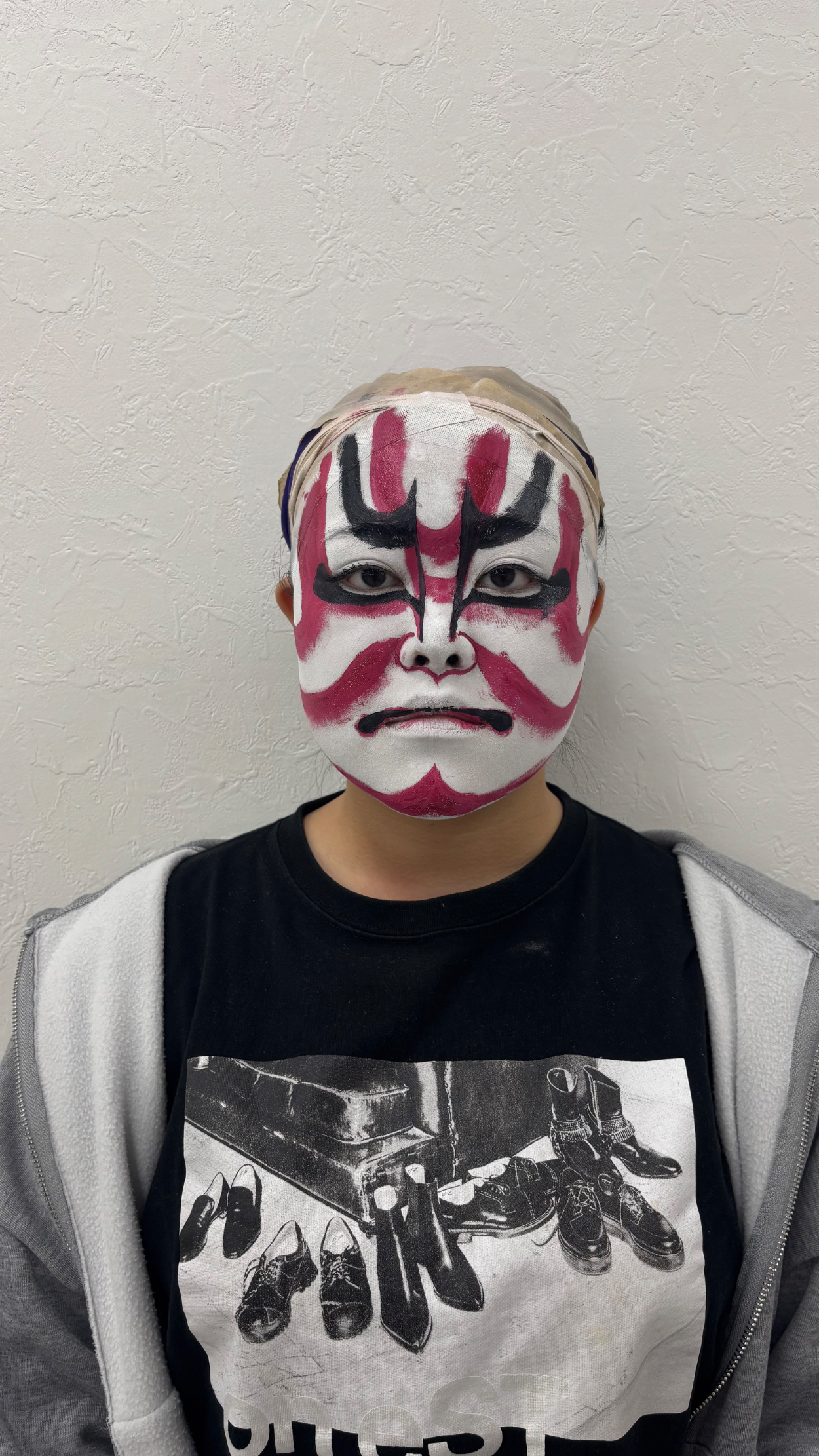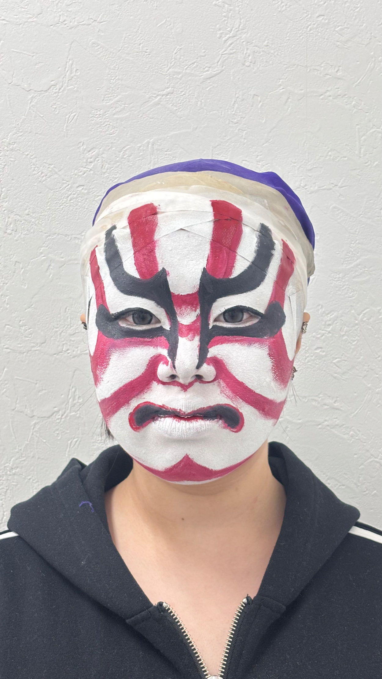 歌舞伎メイク 江川望愛 学生 歌舞伎の隈取を参考に、力強さを意識して制作しました。筆ではなく指を使うことで線に勢いを出し、あえて均一にしすぎないことで表情に動きを加えています。赤と黒のコントラストを強調し、顔の骨格に沿って描くことで動き、表情を出しました