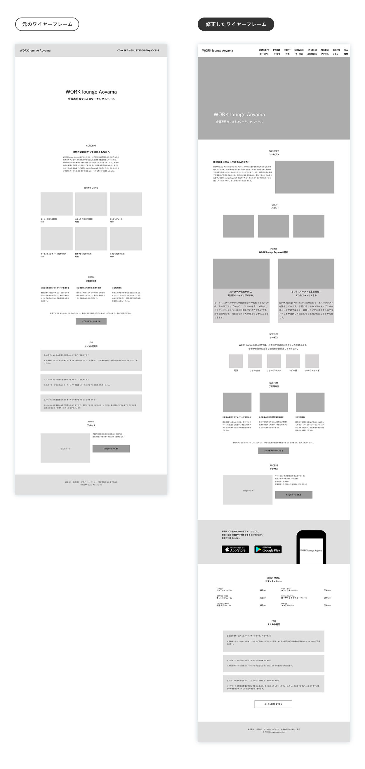 ❸どうやって利用するのか(システム)を上部にまとめました。 - 上記を受け、「カフェメニュー」の情報自体は優先度が低いと考え、文字のみにまとめて順番を他のセクションよりも位置を下げました。