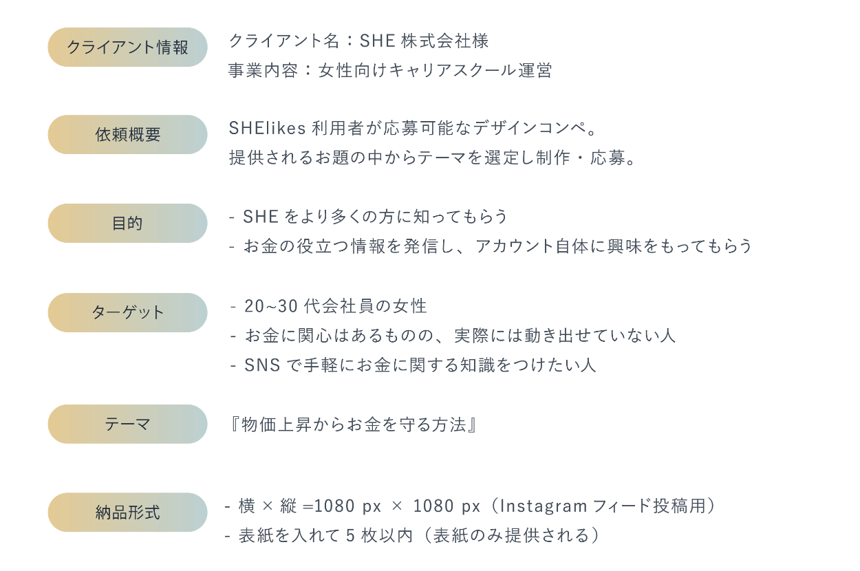 女性向けスクール[ SHEmoney ]や[ SHElikes ]を運営している「SHE株式会社様」のSNSクリエイティブコンペにて応募作品が採用されました。