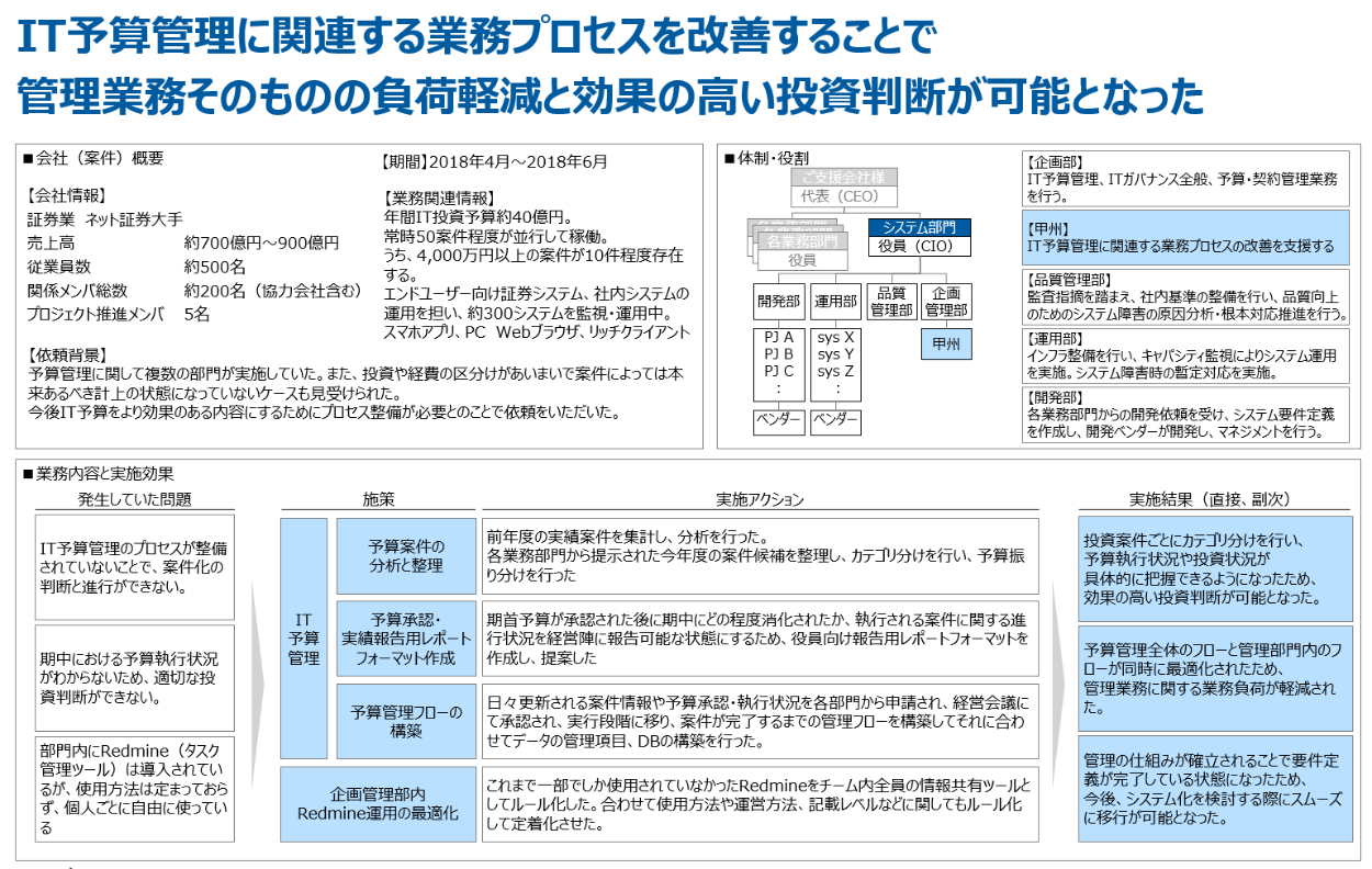 IT予算管理業務プロセス改善 じゅんCIO/CDO@DX王子 御社のCIO代行 / プロジェクトファシリテーター OVERVIEW IT予算管理に関連する業務プロセスを改善することで 管理業務そのものの負荷軽減と効果の高い投資判断が可能となった YEAR 2018