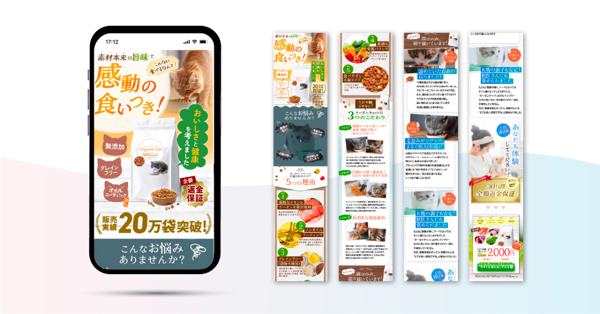 キャットフードLP ちゃぽデザイン WEBデザイナー OVERVIEW 美味しさと健康が特徴のキャットフードのLPを制作しました。 美味しさと健康が特徴のキャットフードのLPを制作しました。メインカラーをオレンジで設定し、「感動の食いつき!」というベネフィットを際立たせて作成しました。グリーンで健康やナチュラルな製法を表現しました。