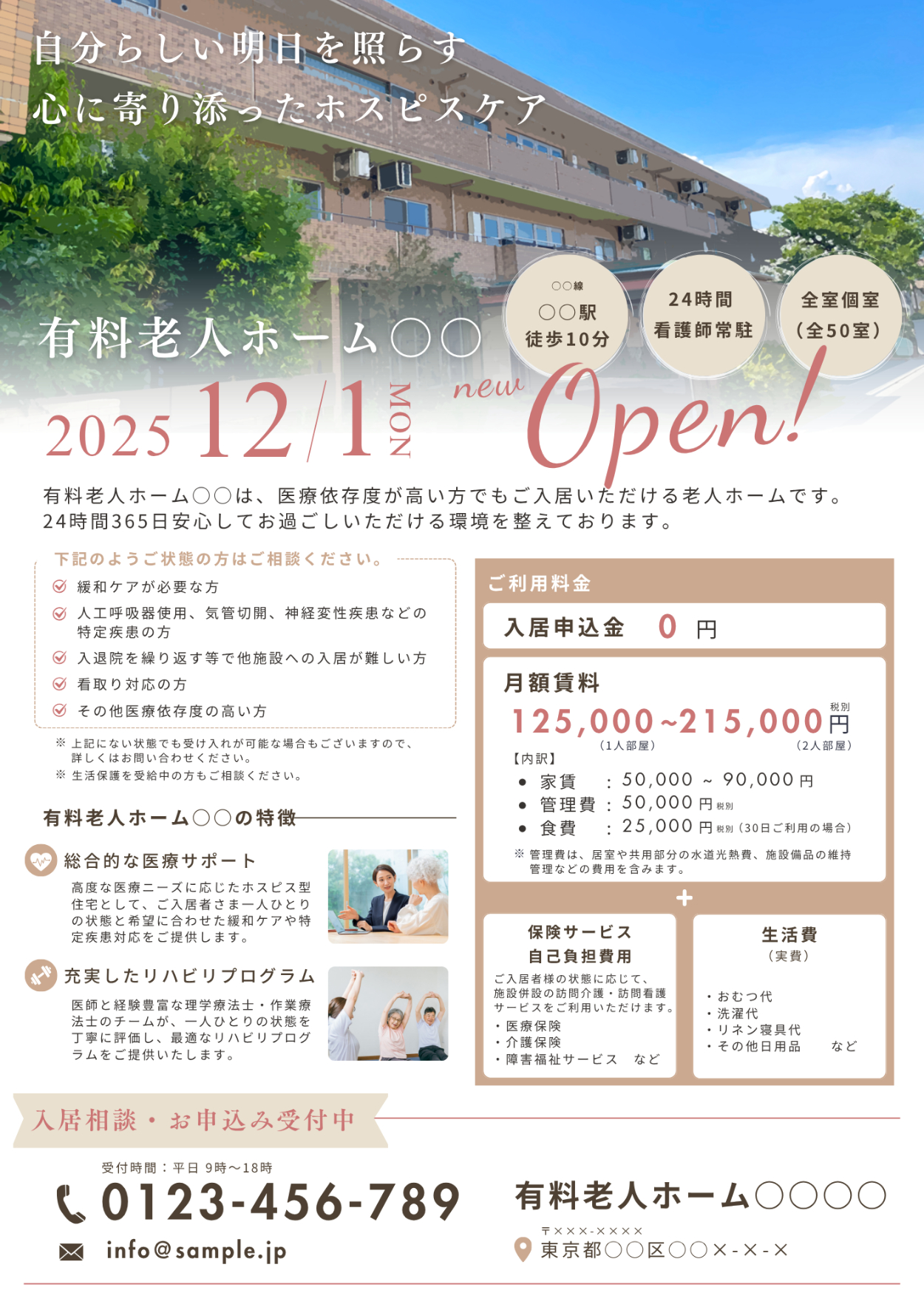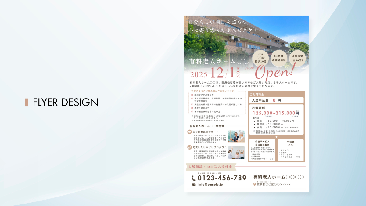 新規オープンする介護施設の認知を目的としたチラシを制作。 「家族が安心できる」「明瞭な料金・安心のサポート体制」といった強みをわかりやすく伝え、必要とする人が手に取り、自分ごととして読み進められるような構成を意識しました。