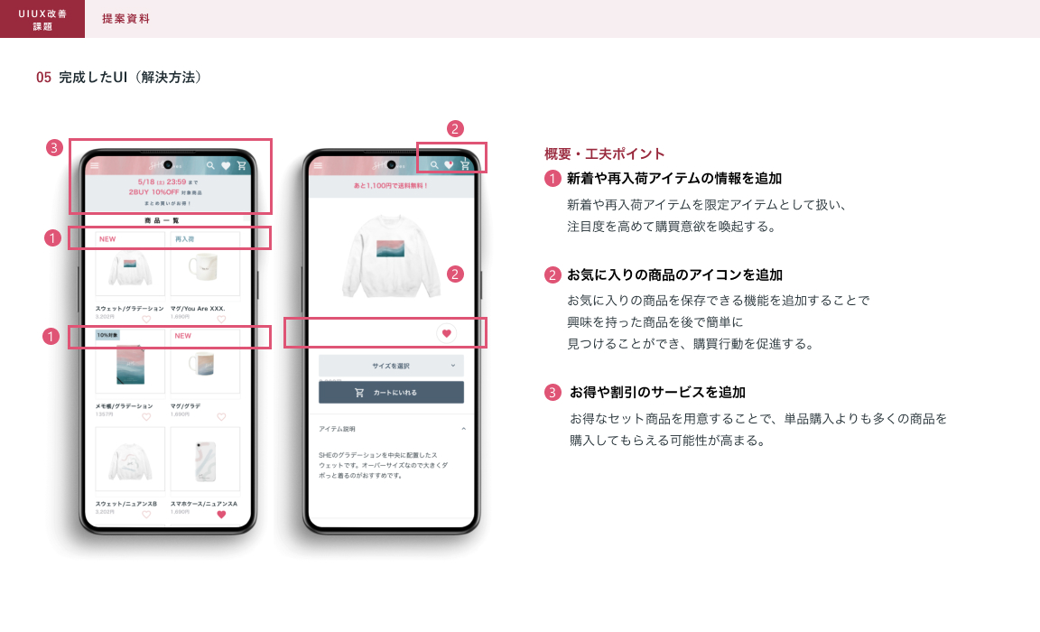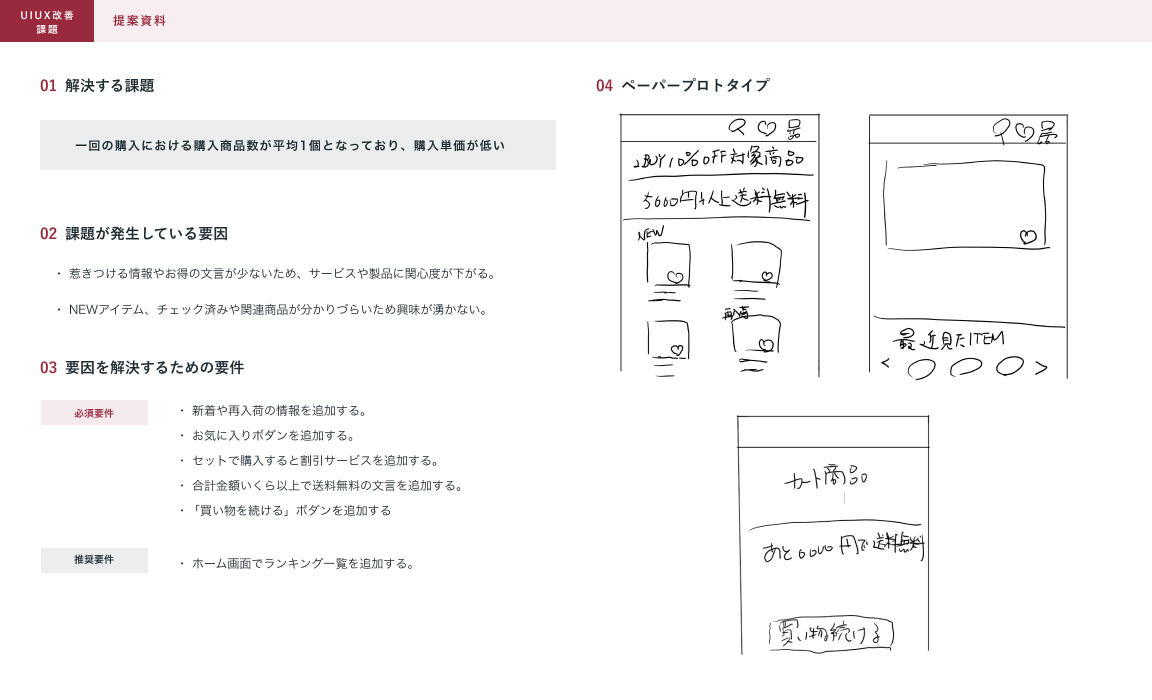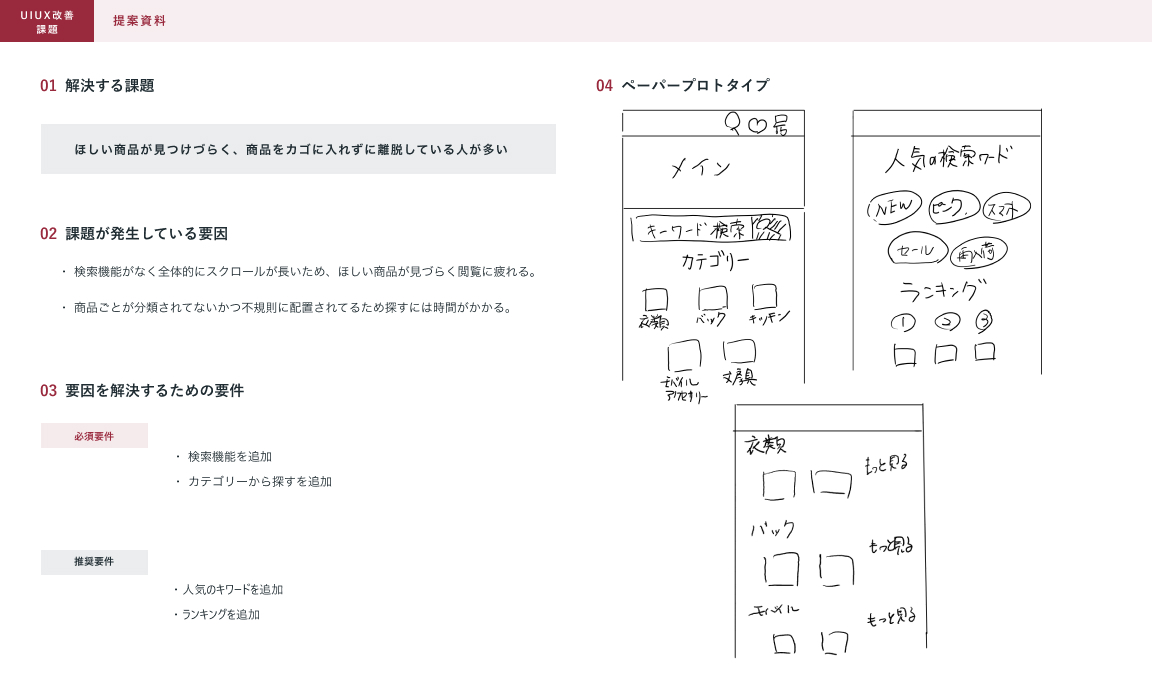 課題①:欲しい商品が見つけづらく、商品をカゴに入れずに離脱している人が多い。