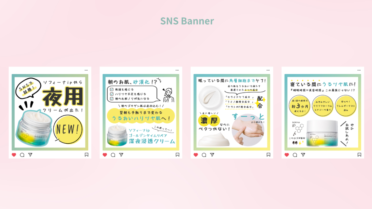 ・「朝のお肌砂漠化!?」「朝のゴキゲン肌は夜仕込む!」という文言でUGC風の言い回しを意識しながら夜に使って欲しいものであることが伝わるよう明示しました。