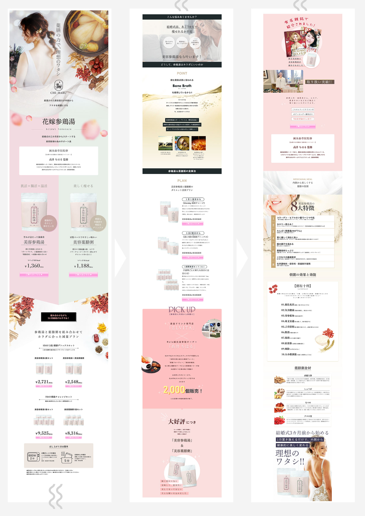 メインビジュアルに「薬膳の力で、理想のワタシ」というキャッチを提案し採用されました。商品紹介は2種類、一目でわかるよう対比で、左右に配置し選びやすいよう工夫しました。カラーは、若年層がターゲットなのでパステルカラーで手に取りやすさを出しています。