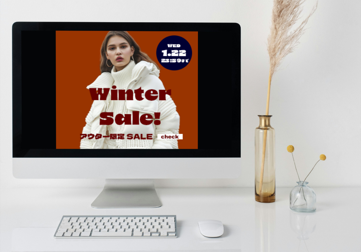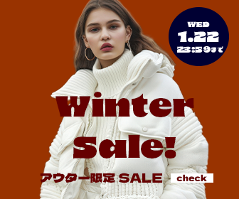白いアウターを着たモデルをメインに配置した冬のセール告知バナー。背景は濃いブラウンで統一し、「Winter Sale!」のキャッチコピーを大きく配置。右上には「1.22(水)23:59まで」の期限を示す円形パーツを配置し、期間限定感を演出している。下部には「アウター限定 SALE」「check」などの行動喚起要素を加え、購買誘導を目的としたデザインとなっている。