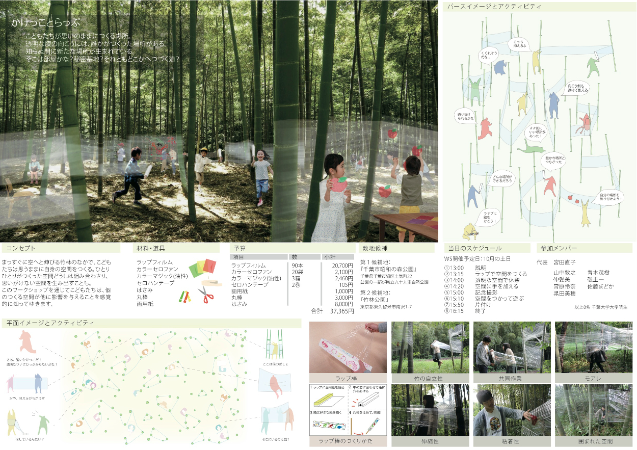 [企画]かけっことらっぷ(コンペ) Reina Miyahara 事業企画/企画営業/設計 OVERVIEW 子どものためのワークショップのコンペ YEAR 2013 対象地:東京都世田谷区期間:2013年『第3回 子どものまち・いえワークショップ提案コンペ』出品。第3位。有志10名で参加。計画過程で試作品の作成を重ねた。<担当業務>企画、資料作成、プレゼン