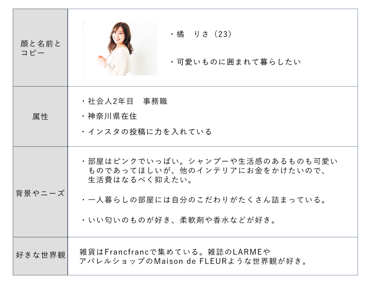 ペルソナに届けるデザインイメージを考える際には、好みそうな雑誌やショップをイメージすることで、より具体的なビジュアルの方向性が見えてきやすいと感じました。今回、シャンプーのデザインとペルソナのイメージから、彼女が好みそうな雑誌を連想してみたことで、デザインのイメージが一気に具体化される感覚を得ました。また、ペルソナを“誰か身近な人物”として捉え、その人の好みを想像しながら考えることで、デザインの軸がぶれることなく、より的確に方向性を定められるという学びがありました。