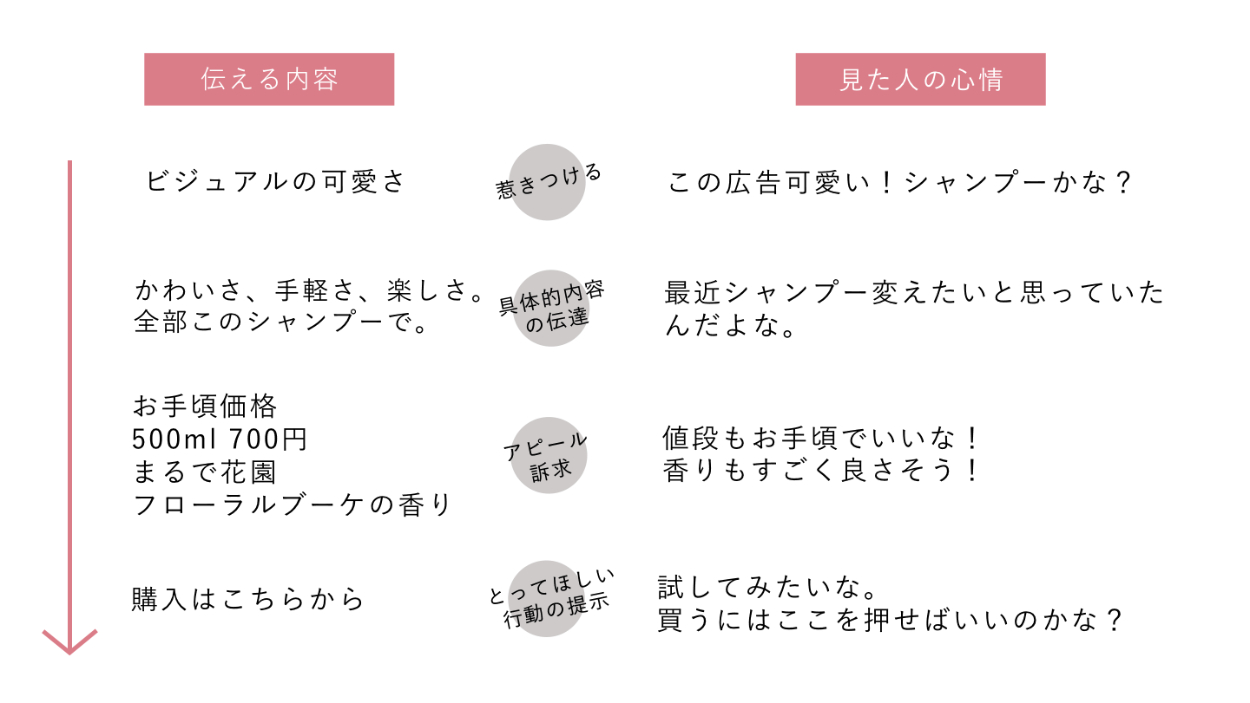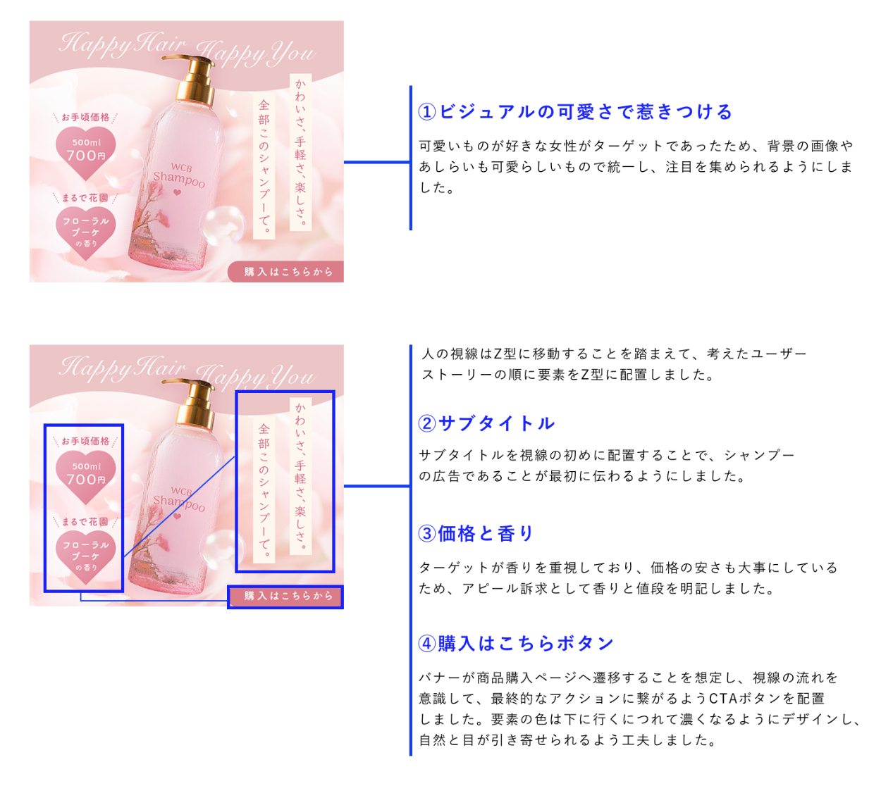 シャンプーに関する具体的な情報やCTAボタンには丸ゴシック体を使用し、可愛らしく親しみやすい印象を与えることで、手に取りやすい価格帯であることが伝わるようにしました。一方で、キャッチコピーとサブタイトルには筆記体と明朝体を使い、情報の区別をつけながらエレガントさも表現しています。シャンプーのボトル自体が「可愛らしさ」と「エレガントさ」の両方を感じさせるデザインとなっているため、フォント選びでもそのイメージを表現しました。