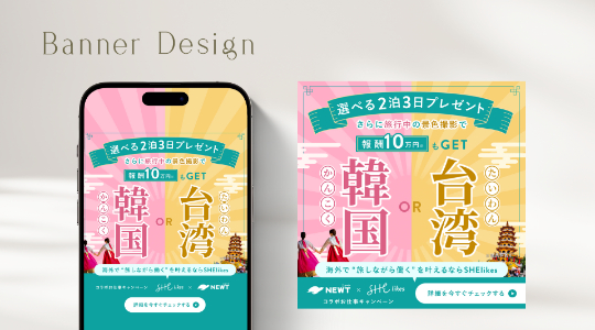 バナーデザインの練習課題として制作を行いました。「かわいい・安い・楽しい」というイメージを表現できるよう、配色やあしらいに工夫を凝らしてデザインしました。