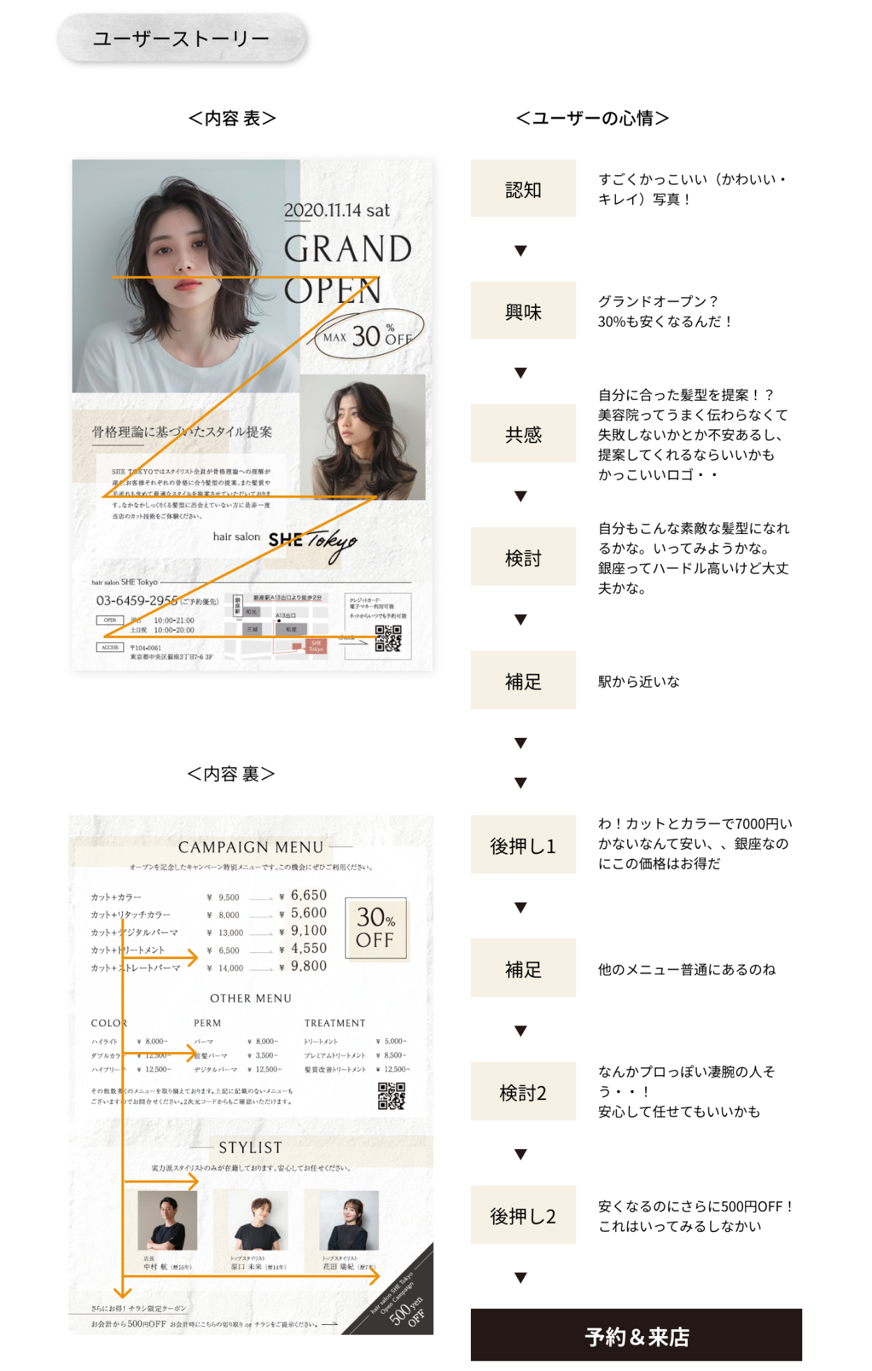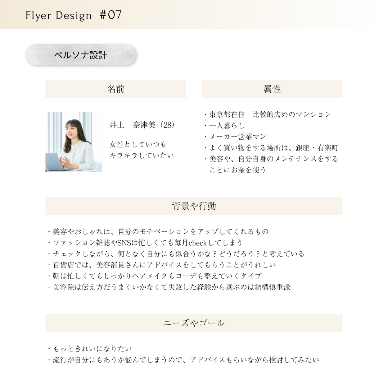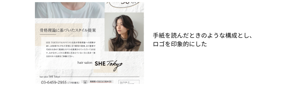 - 情報設計として、一番知ってほしい「骨格理論~スタイル提案」が伝わるように手紙のような構成として最後にロゴをもってきて印象付けるようにしました。