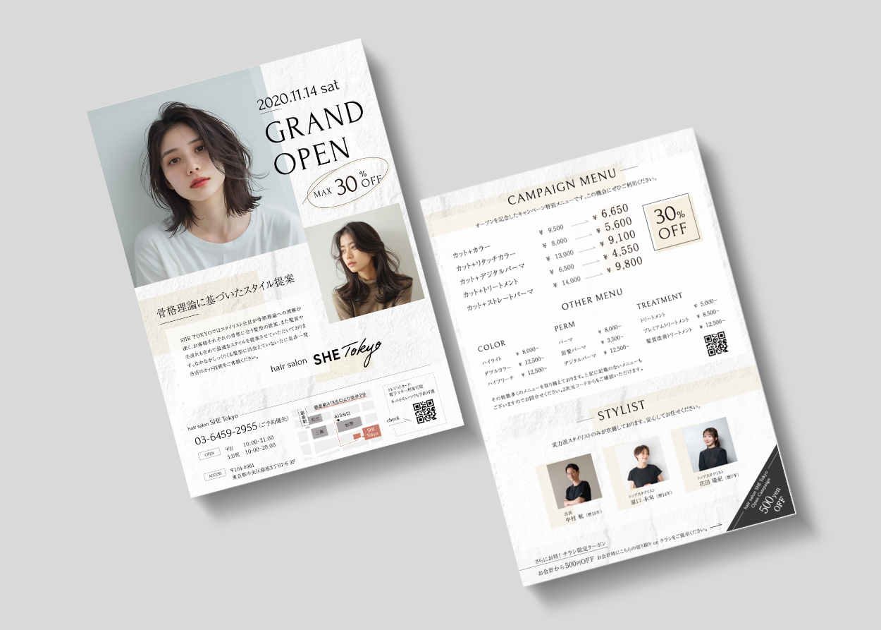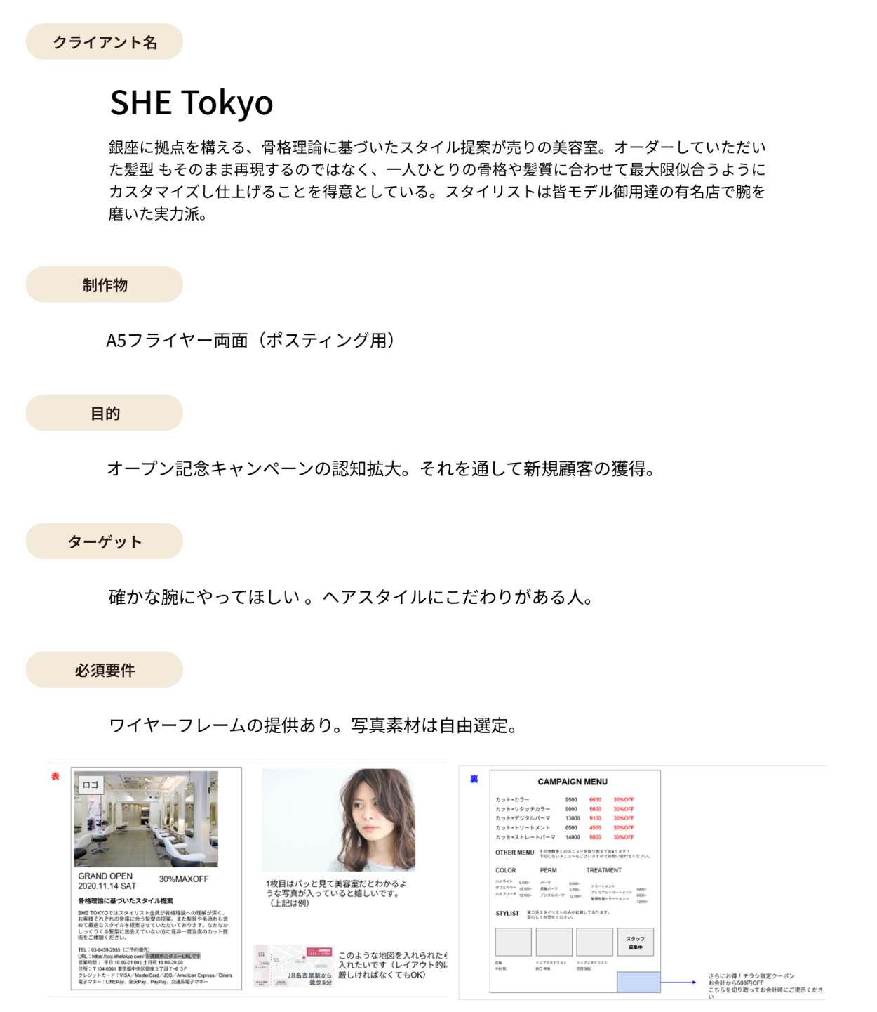 SHElikes MULTI CLEATOR COURSEの課題にて、架空クライアントの依頼内容をもとに、印刷物のデザインから入稿データ作成までを取り組みました。Webデザインとは異なる文字や要素のサイズの感覚やデータの作り方を学びました。