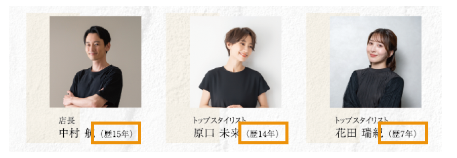 - 美容師の情報には、経験を積んでいることがわかるように「歴〇年」を追加しました。